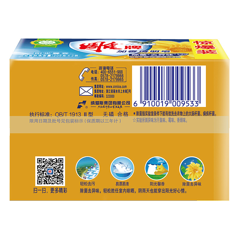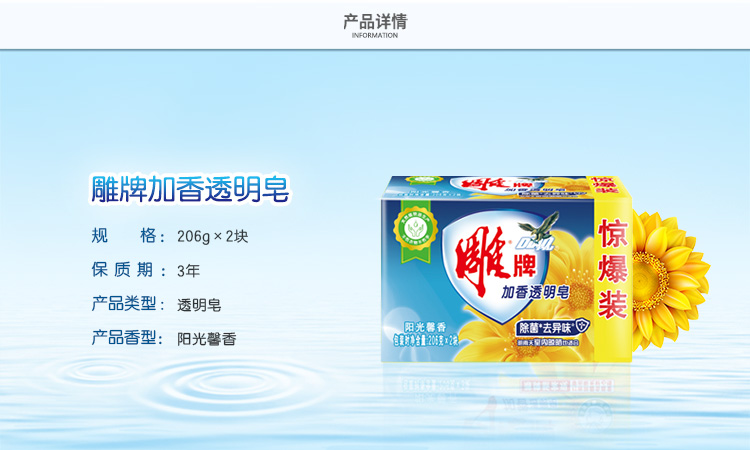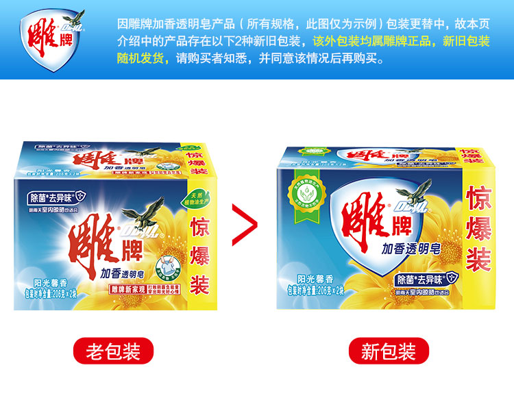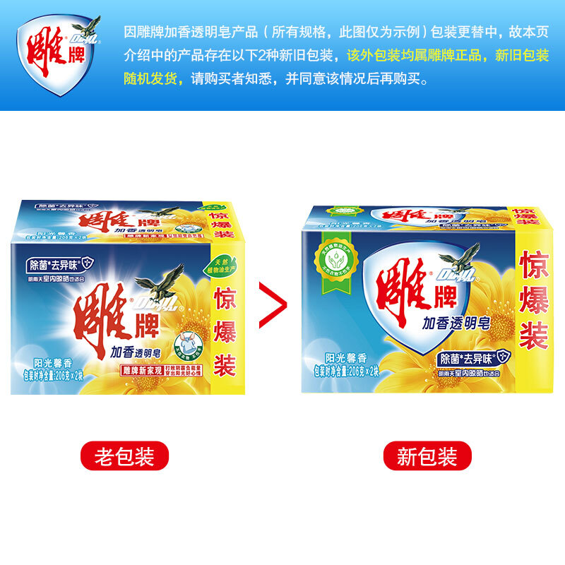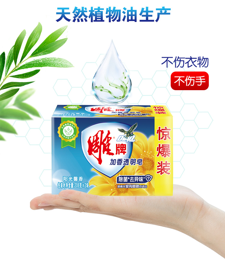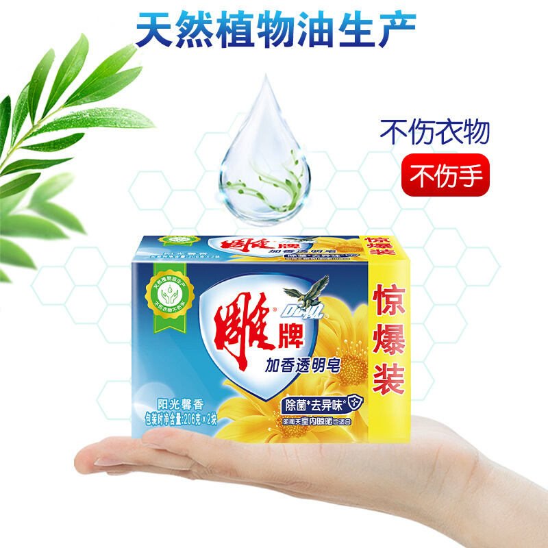 - 商品名称:雕牌 除菌加香透明皂/洗衣皂/肥皂206g*2块 除菌去异味 天然植物油提炼 阳光馨香