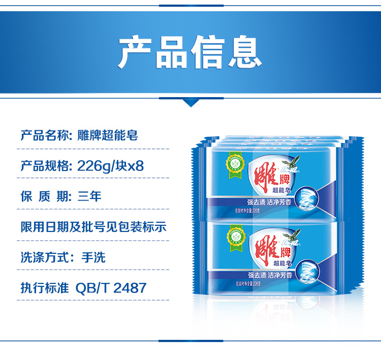 - 商品名称:雕牌 超能皂226g*8块深层祛渍 洗衣皂/肥皂(新老包装随机发货)