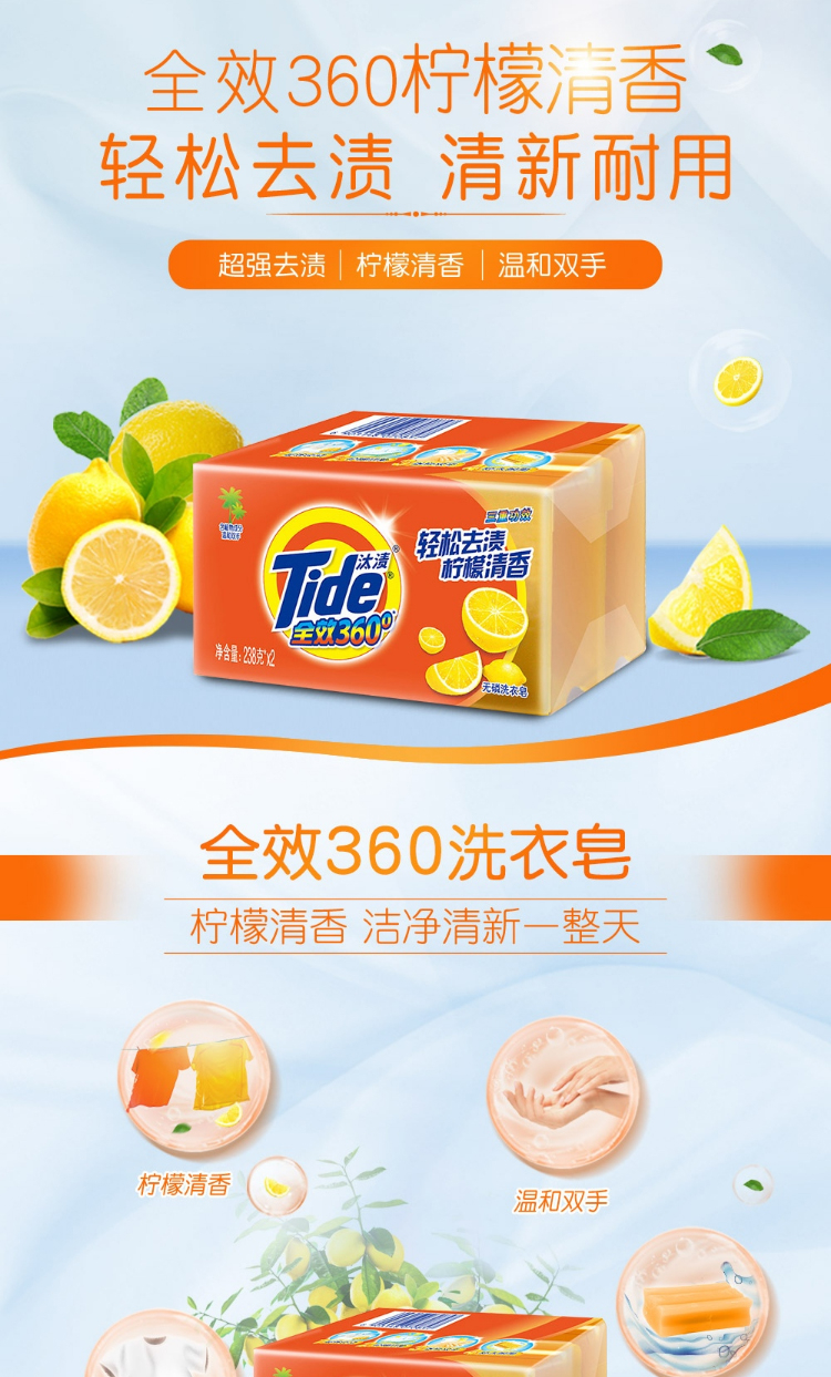 - 商品名称:汰渍 Tide 全效洁净洗衣皂(柠檬清香)238G*2块装 透明皂 肥皂 手洗 温和不伤手