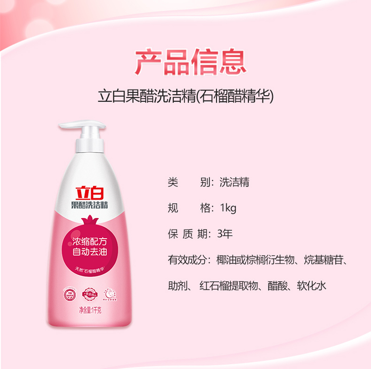 - 商品名称:立白果醋洗洁精1kg 厨具洗涤灵 食品级 石榴精华 果蔬清洗餐洗净 儿童餐具洗洁剂 自动去油安全配方