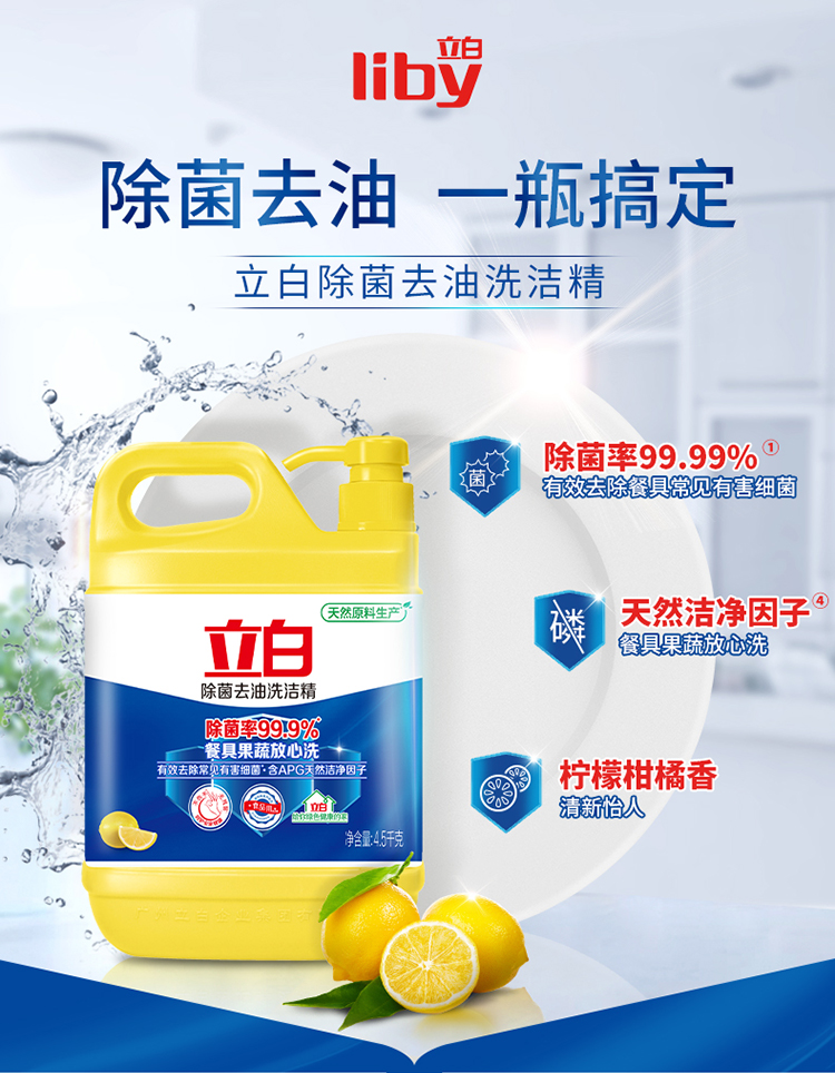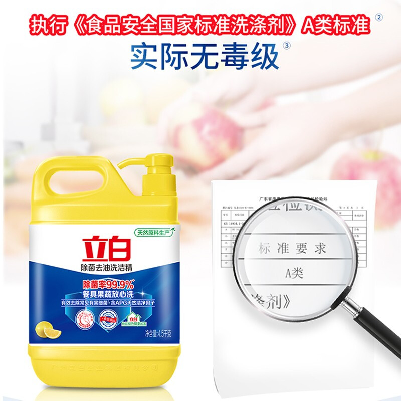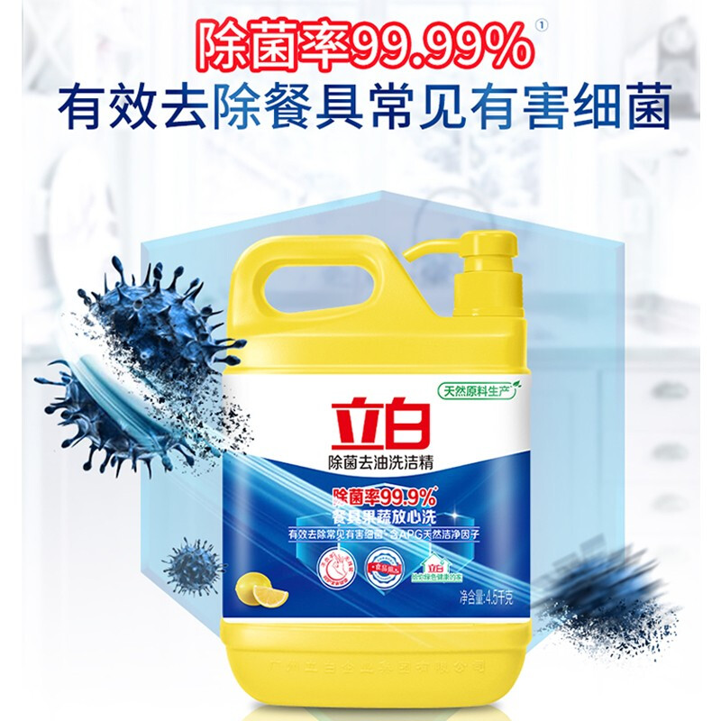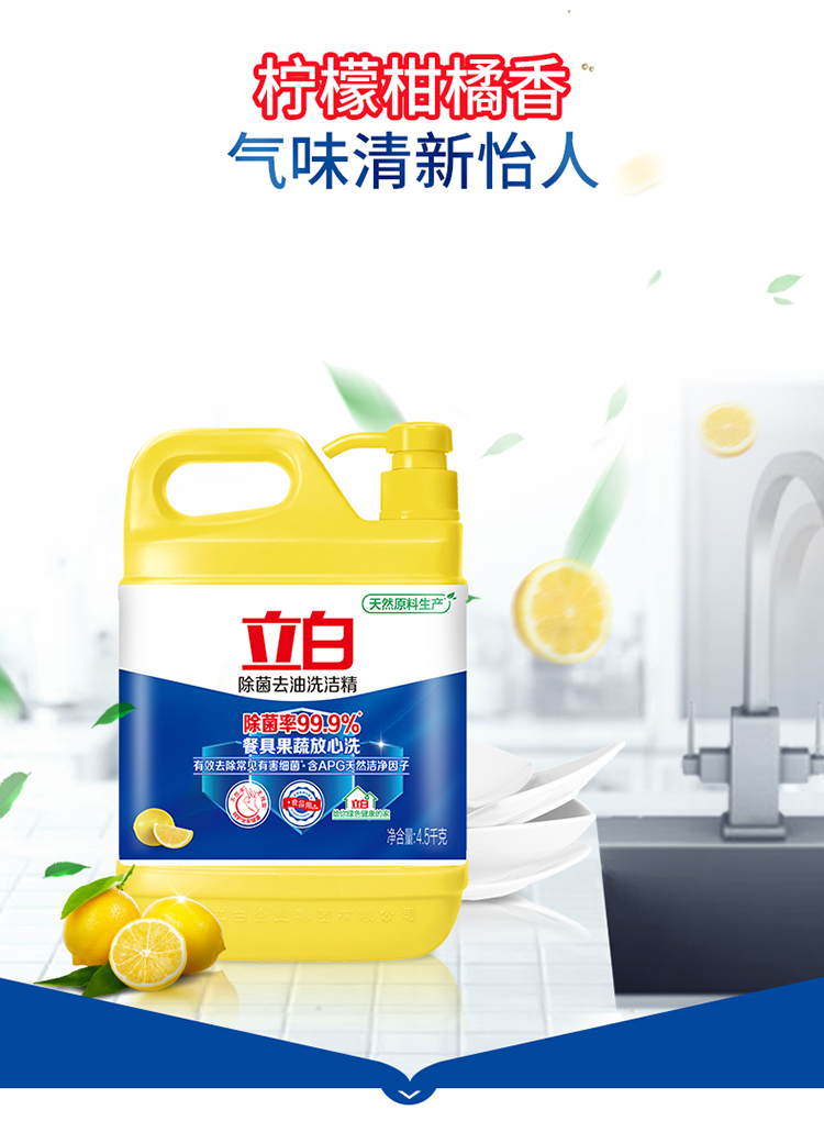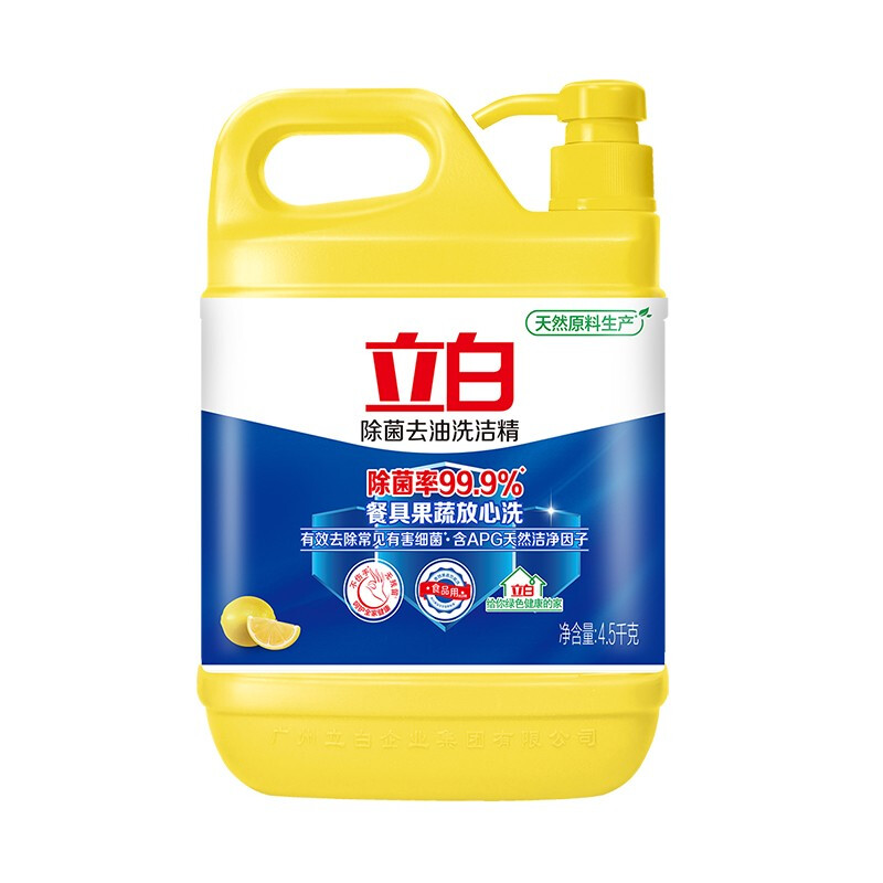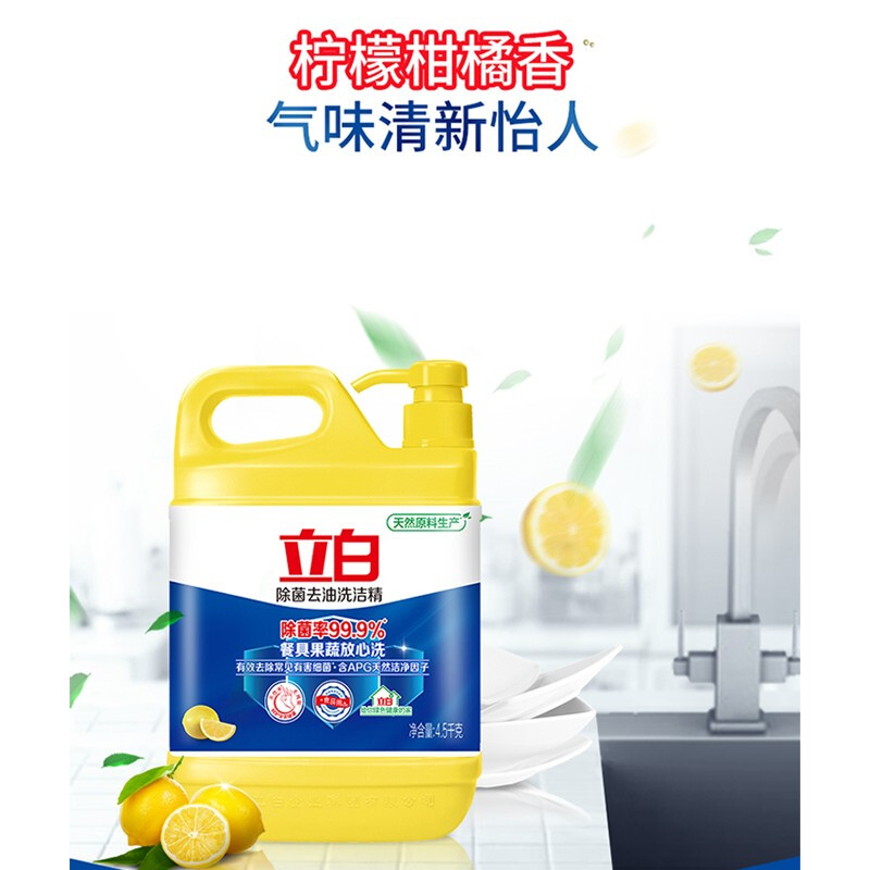 - 商品名称:立白除菌去油洗洁精4.5kg 除菌率99.9%果蔬餐具净 柠檬柑橘香