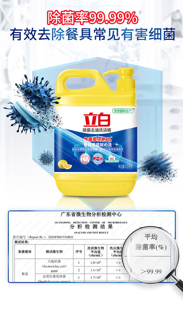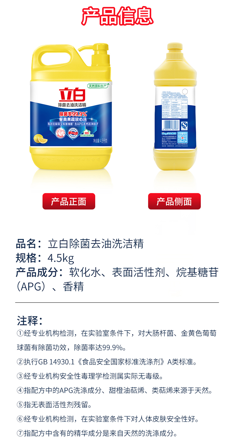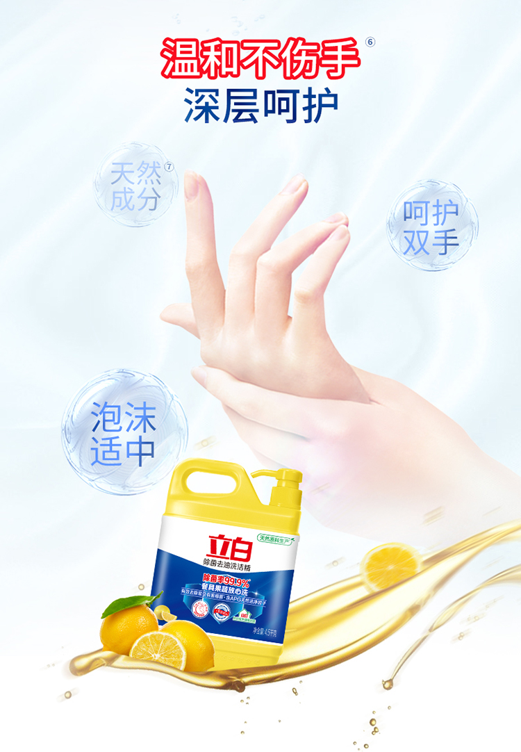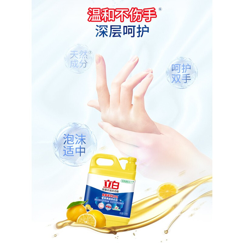 - 商品名称:立白除菌去油洗洁精4.5kg 除菌率99.9%果蔬餐具净 柠檬柑橘香