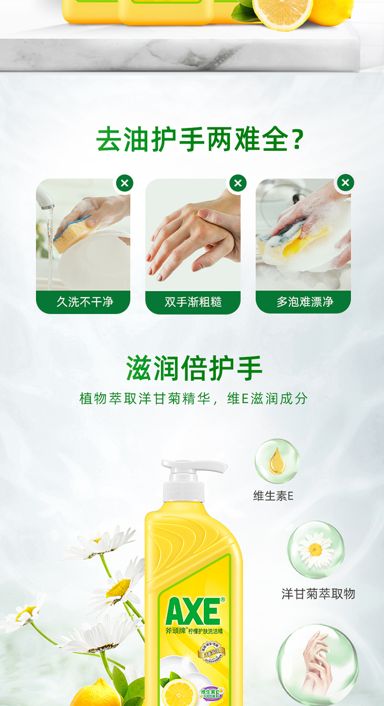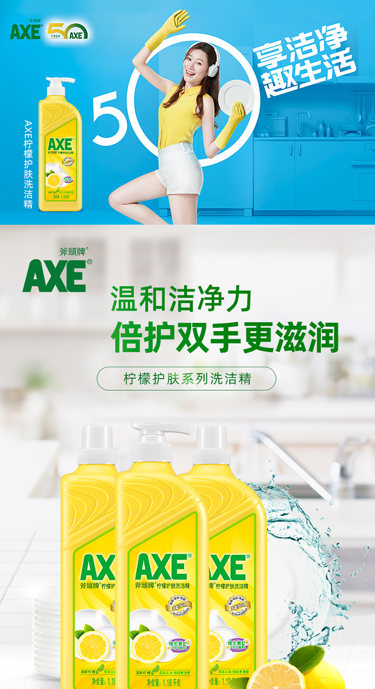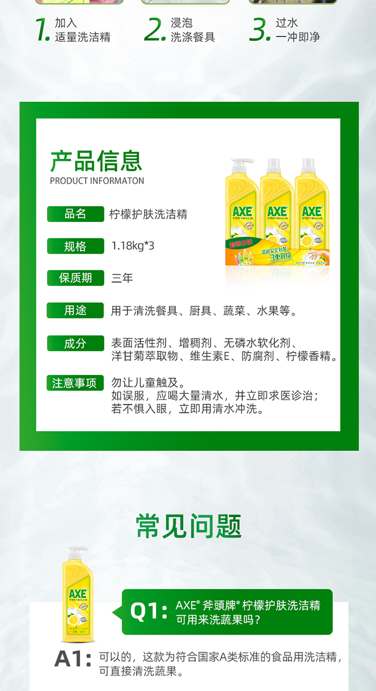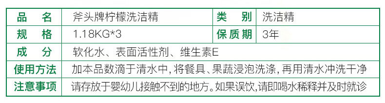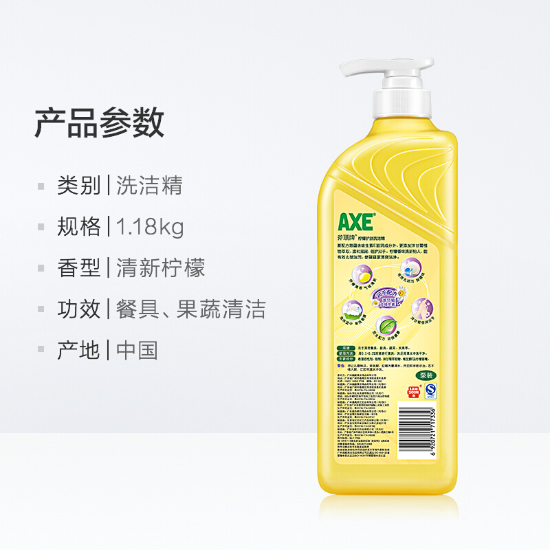- 商品名称:斧头牌(AXE)柠檬护肤洗洁精套装1.18kg*3(1泵+2补)柠檬清香 维E呵护不伤手