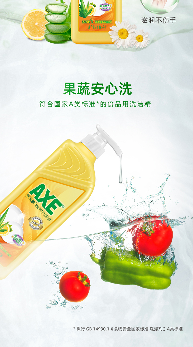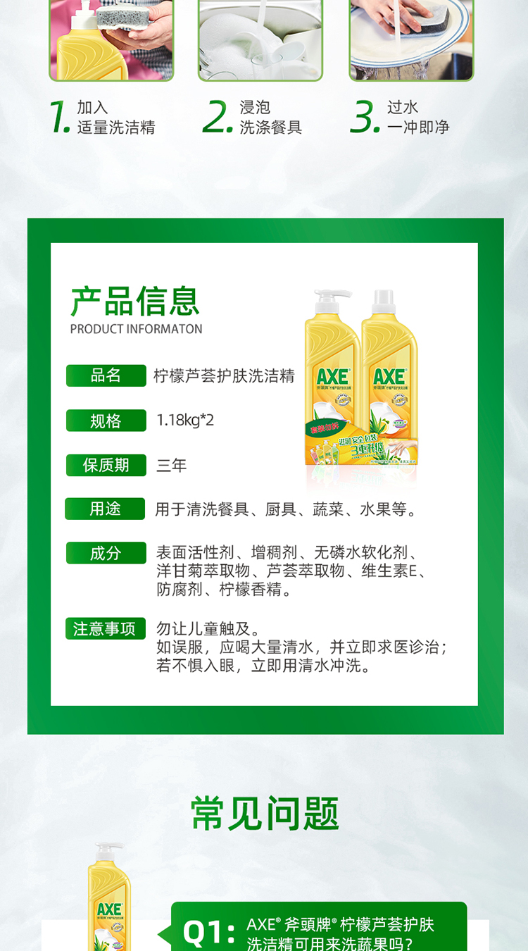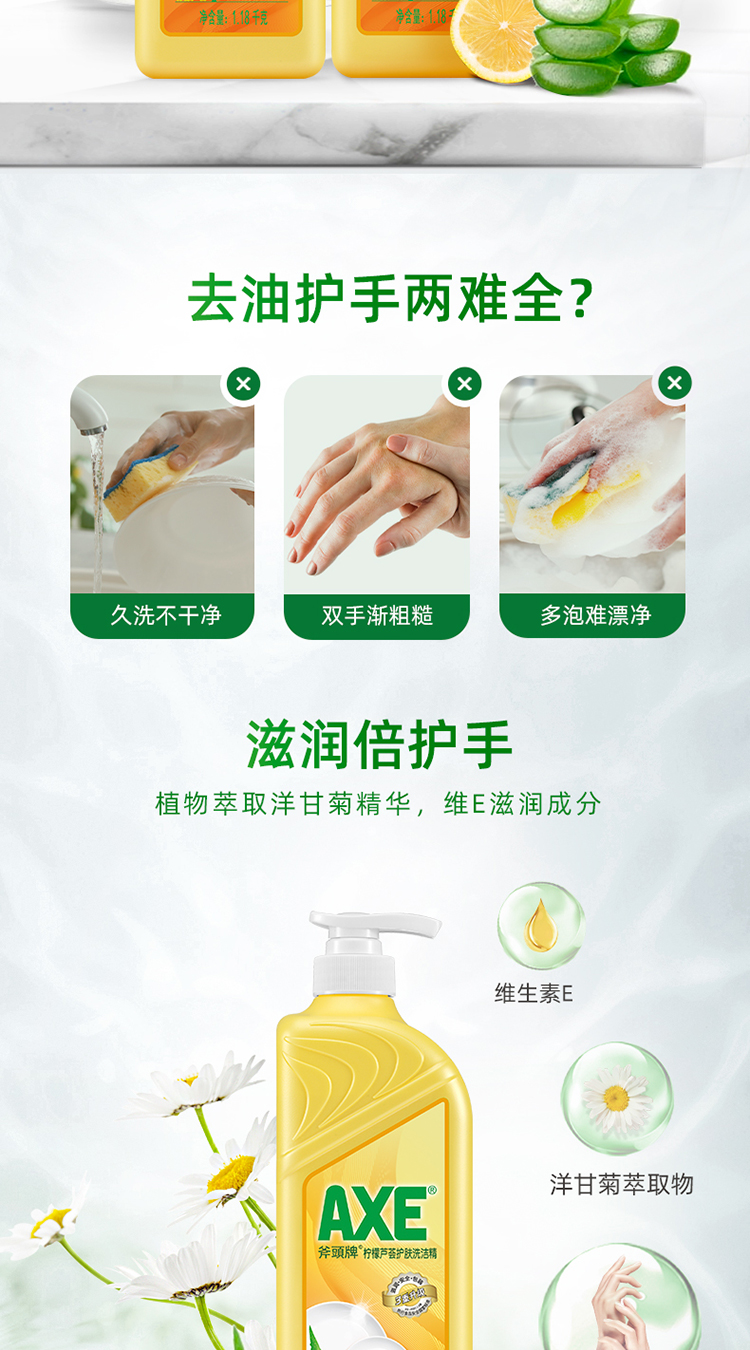 商品名称:斧头牌(AXE)柠檬芦荟护肤洗洁精1.18kg*2瓶快速去油 维E呵护不伤手