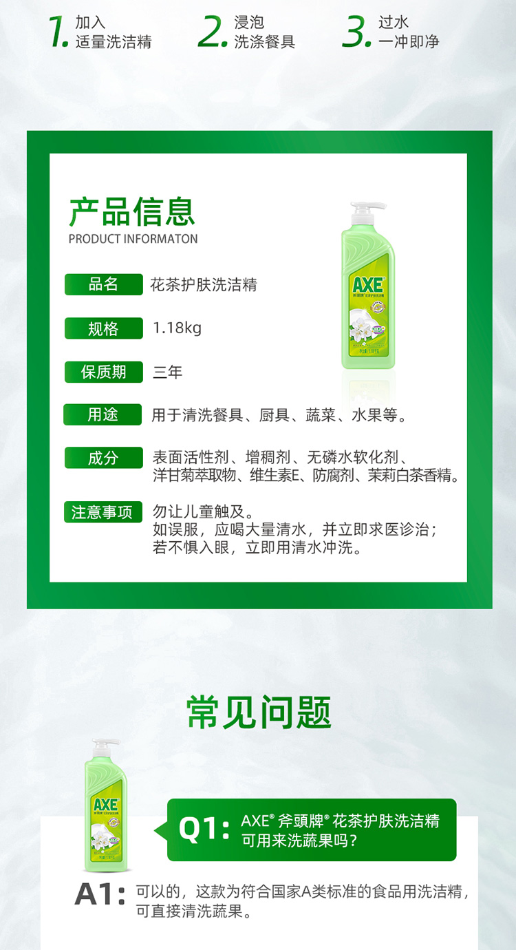 - 商品名称:斧头牌(AXE)花茶护肤洗洁精1.18kg(泵装)花茶清香 维E呵护不伤手