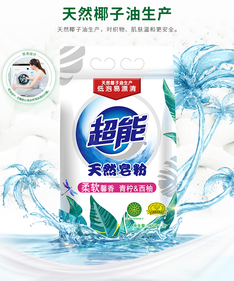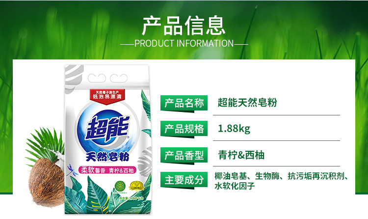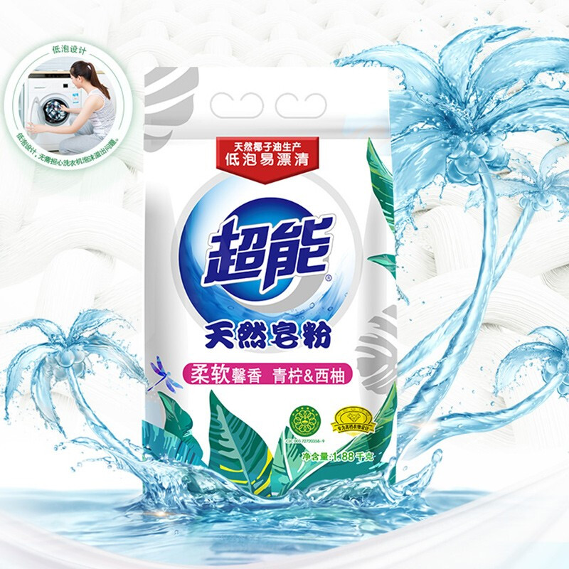 - 商品名称:超能 天然皂粉(馨香柔软)1.88kg 洗衣粉 西柚青柠香型 天然椰油 温和不刺激 低泡易漂 (新老包装随机发)