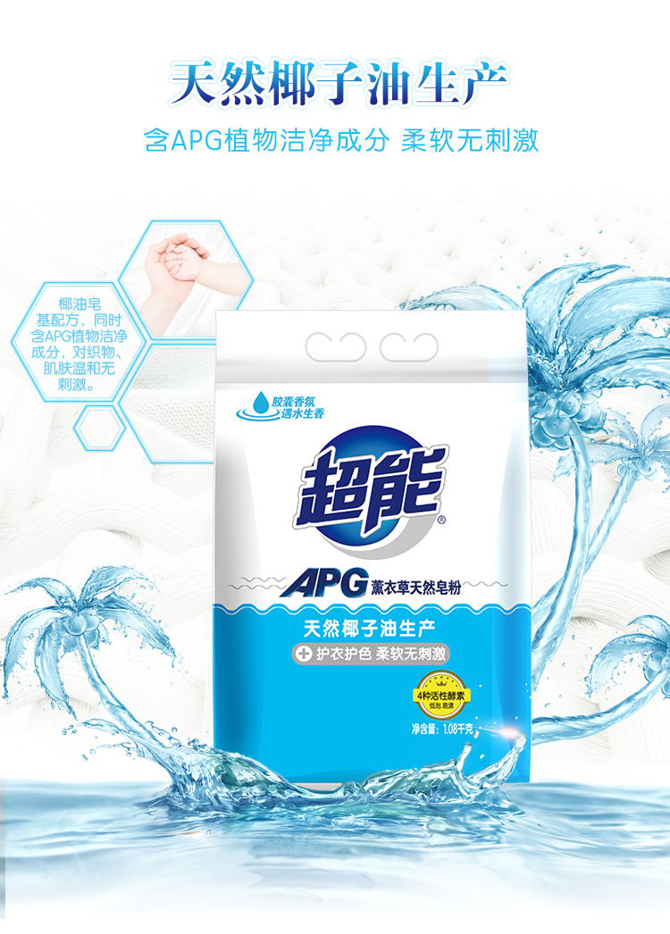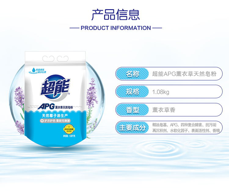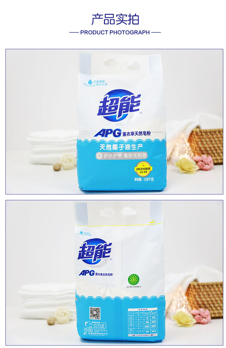 - 商品名称:超能 APG皂粉1.08kg 洗衣粉 薰衣草香 4种活性酵素 胶囊香氛 遇水生香 低泡易漂不刺激 保持衣物鲜艳柔软