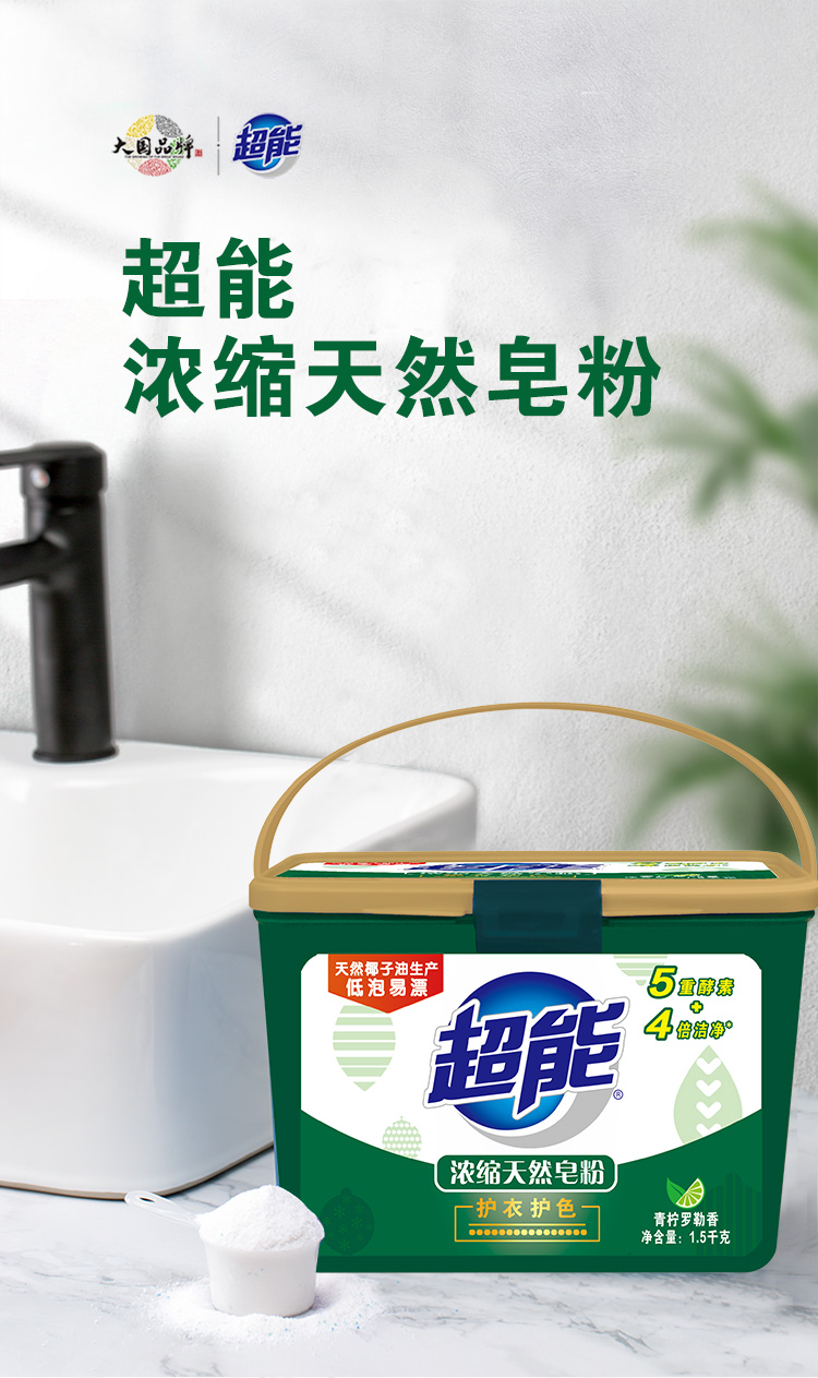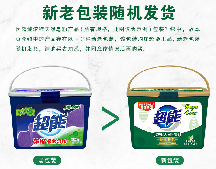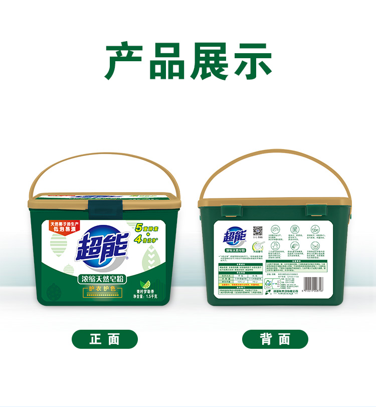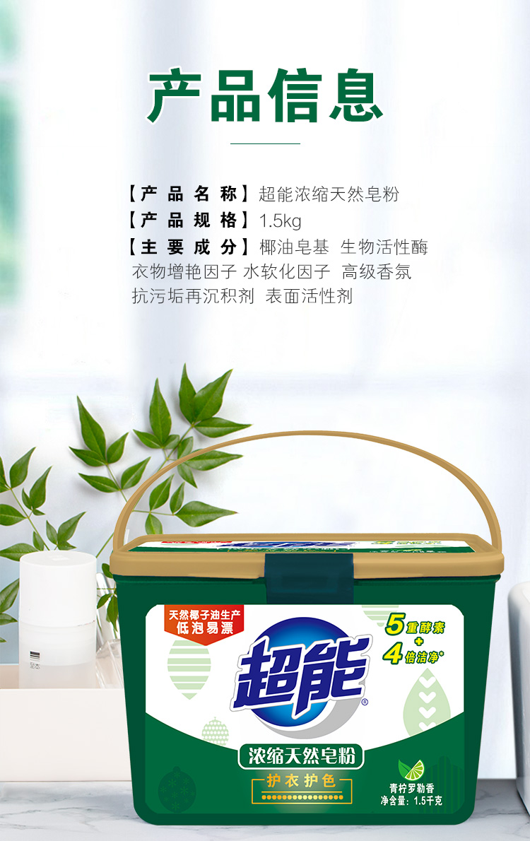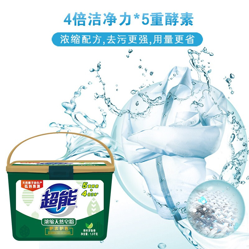 - 商品名称:超能 浓缩天然皂粉/洗衣粉1.5kg 4倍浓缩 低泡易漂 带勺 机洗 冷水高效(新老包装随机发货)