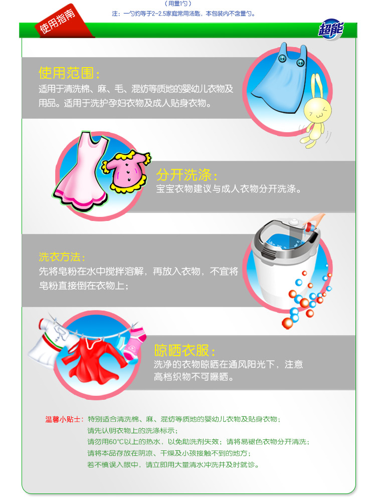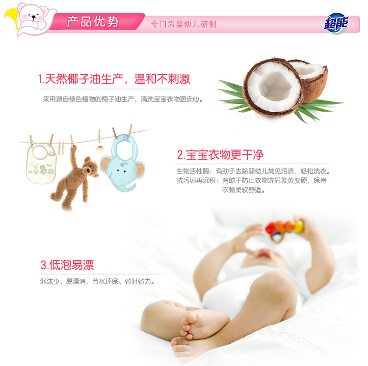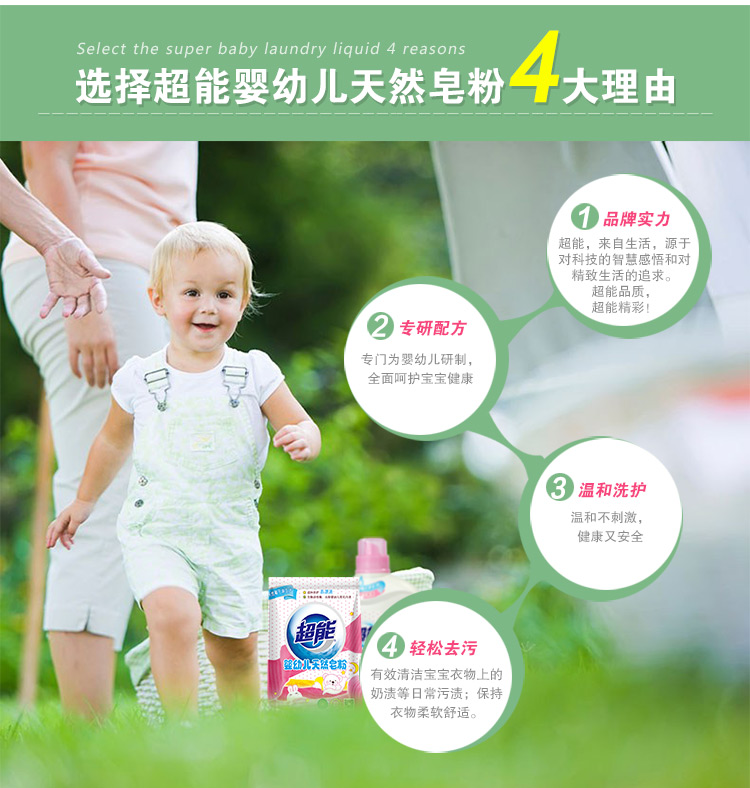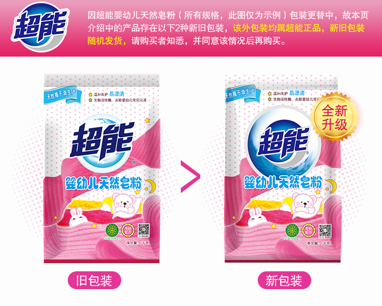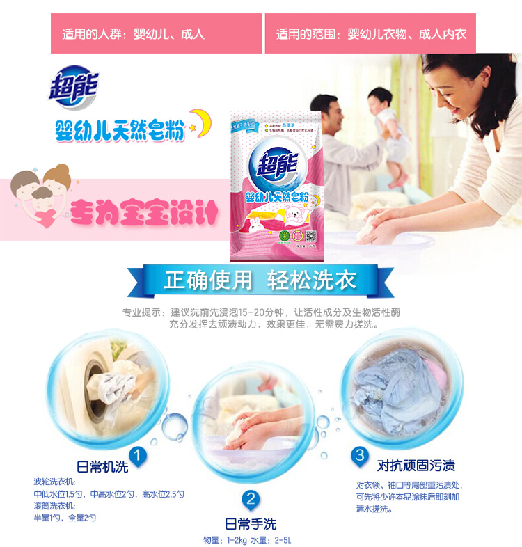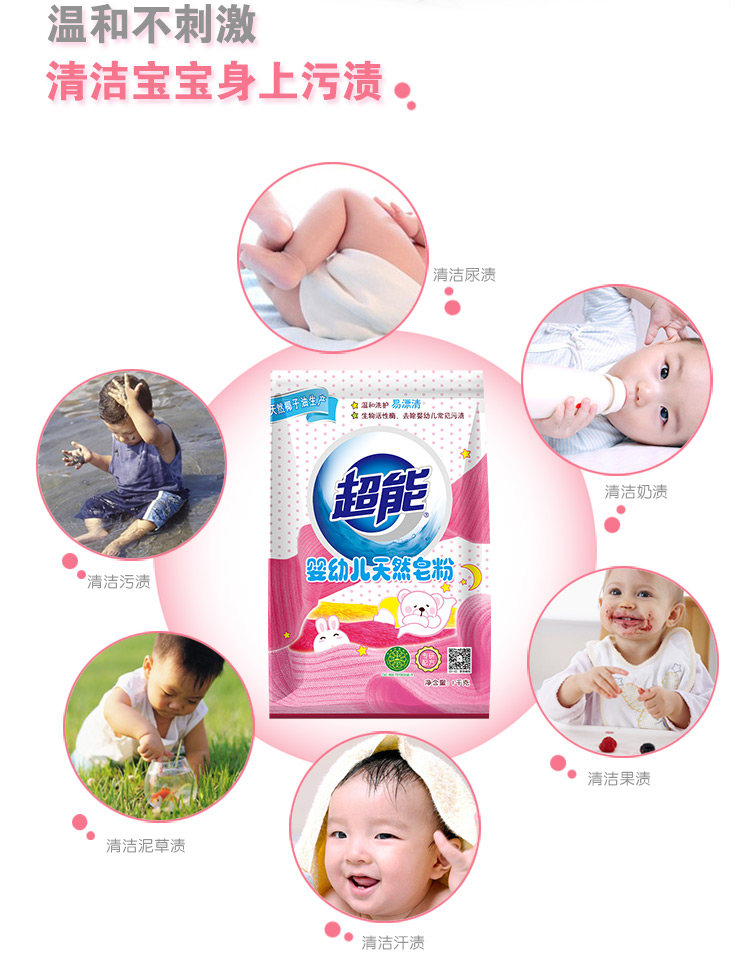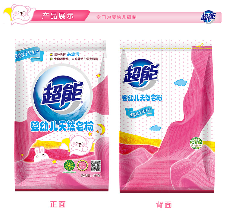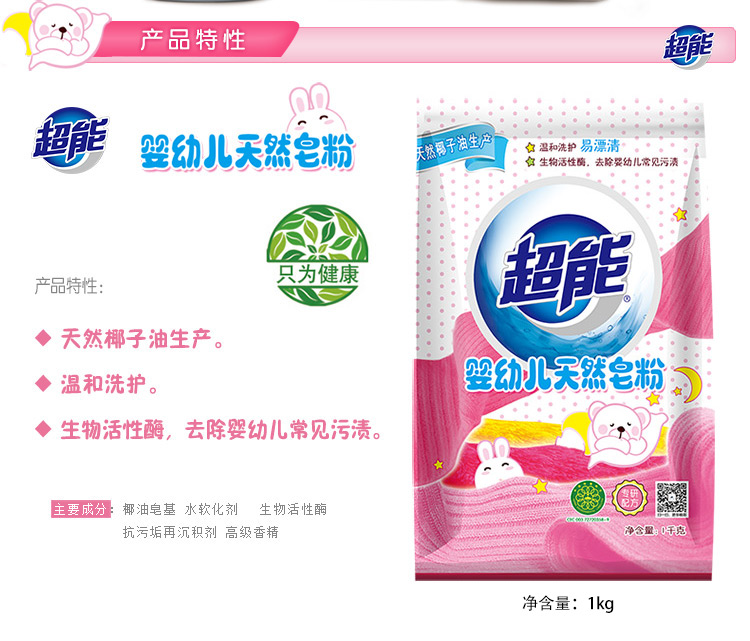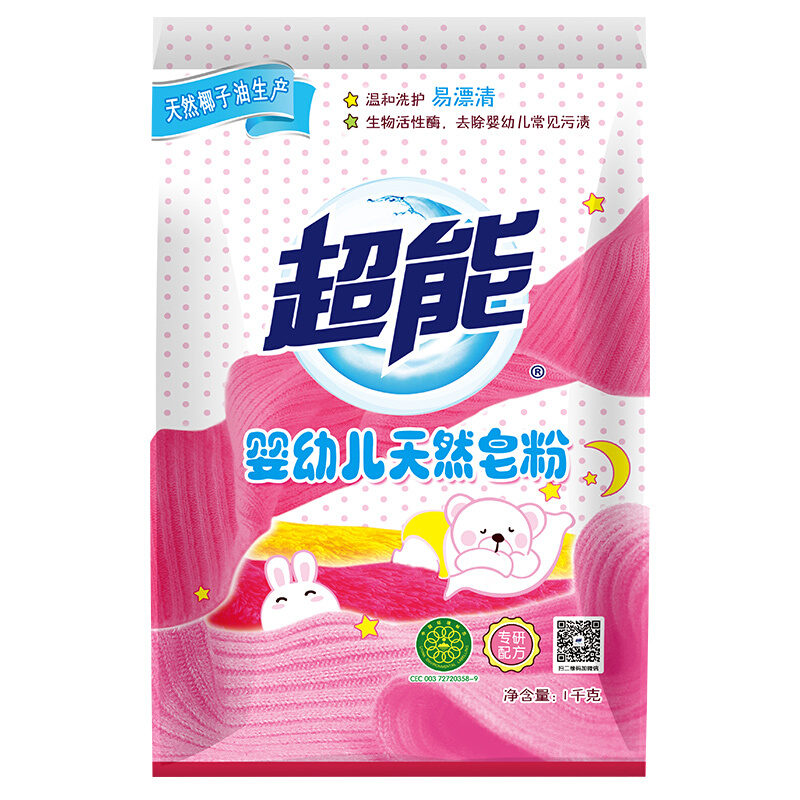 - 商品名称:超能 婴幼儿天然皂粉/洗衣粉1kg(宝宝专研配方)温和安全无添加易漂清 多种生物酶去奶渍汗渍尿渍