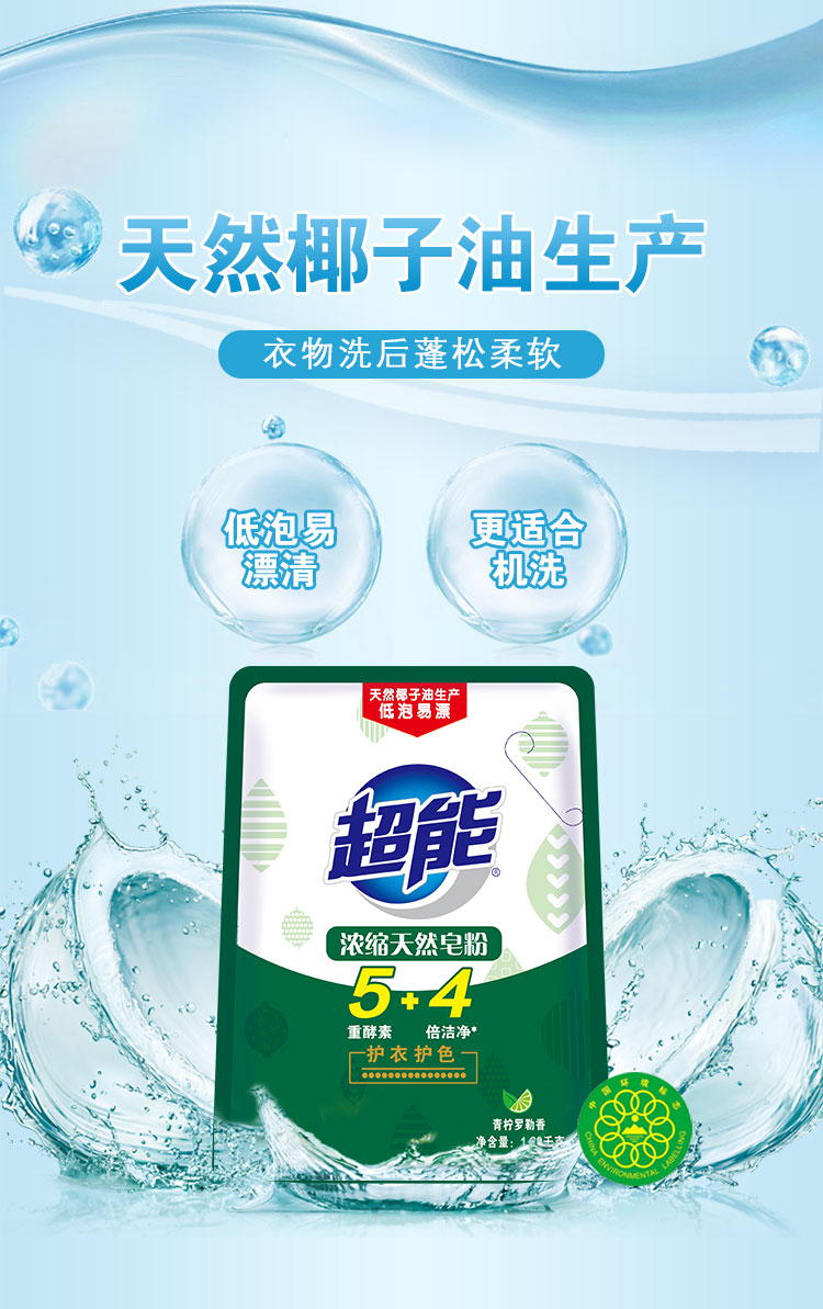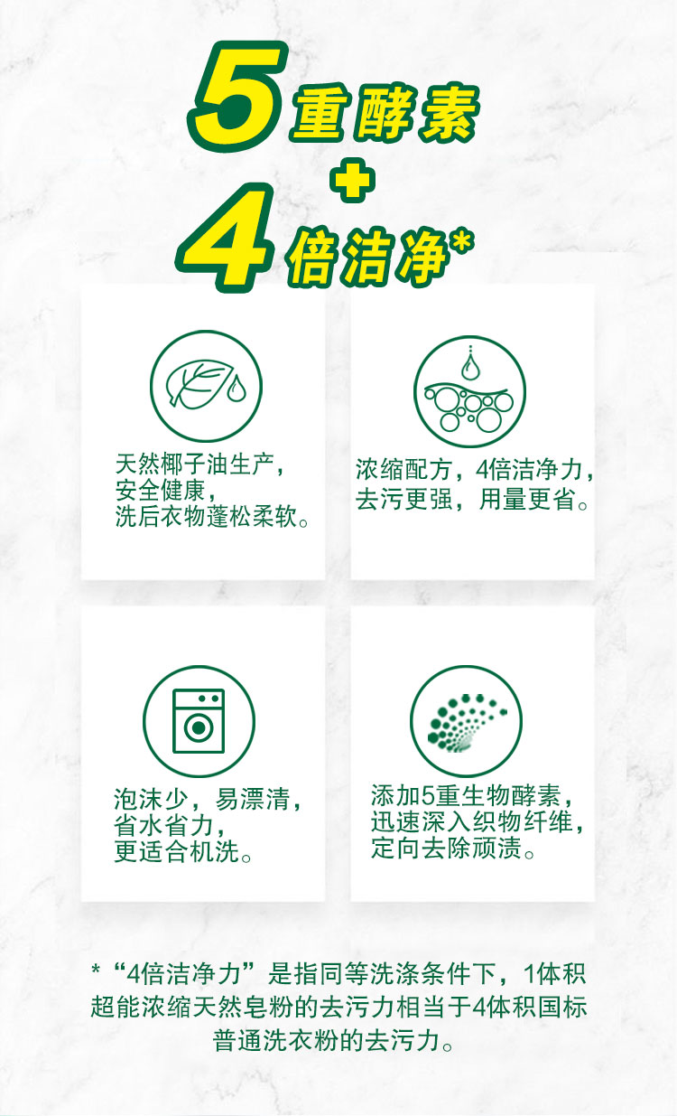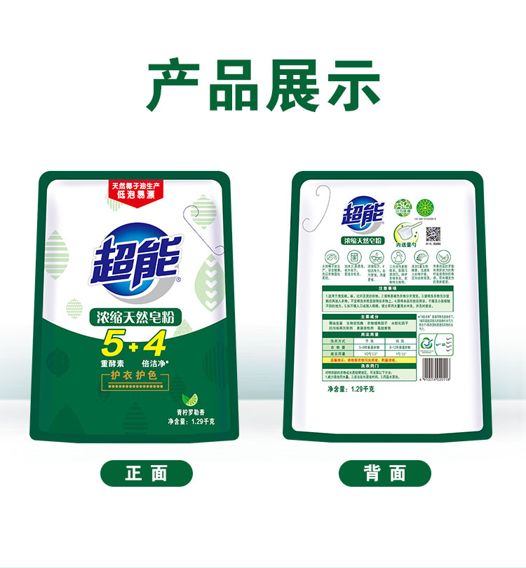 - 商品名称:超能 浓缩天然皂粉1.29kg 洗衣粉 青柠罗勒香 5重酵素 4倍浓缩 天然椰子油 低泡易漂 低温冷水速溶 护衣护色