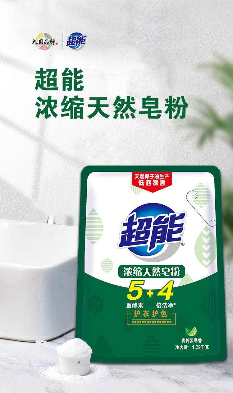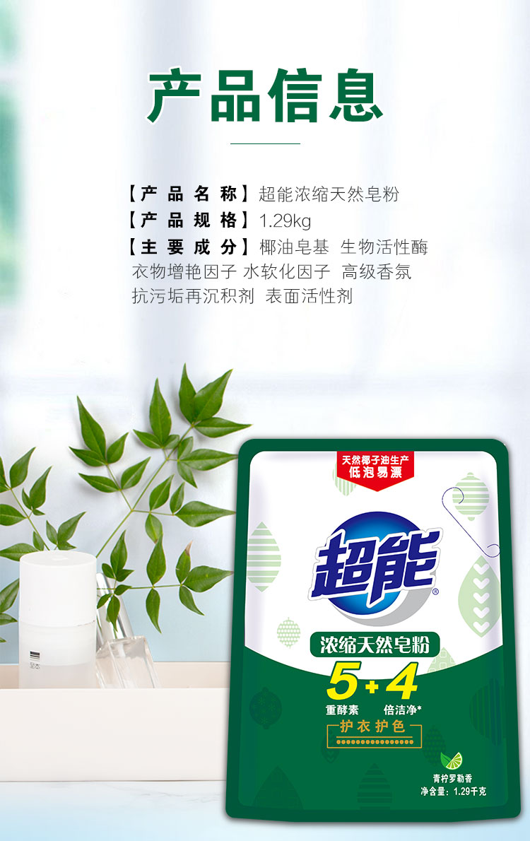 - 商品名称:超能 浓缩天然皂粉1.29kg 洗衣粉 青柠罗勒香 5重酵素 4倍浓缩 天然椰子油 低泡易漂 低温冷水速溶 护衣护色