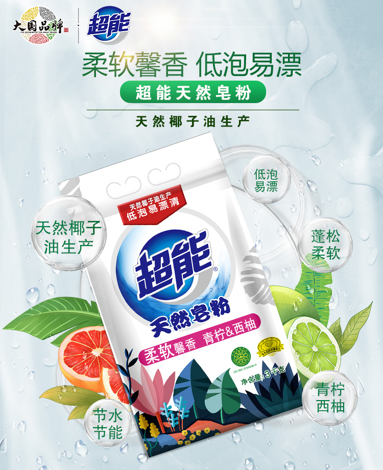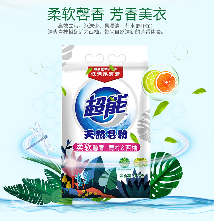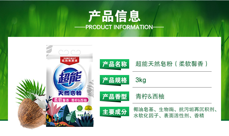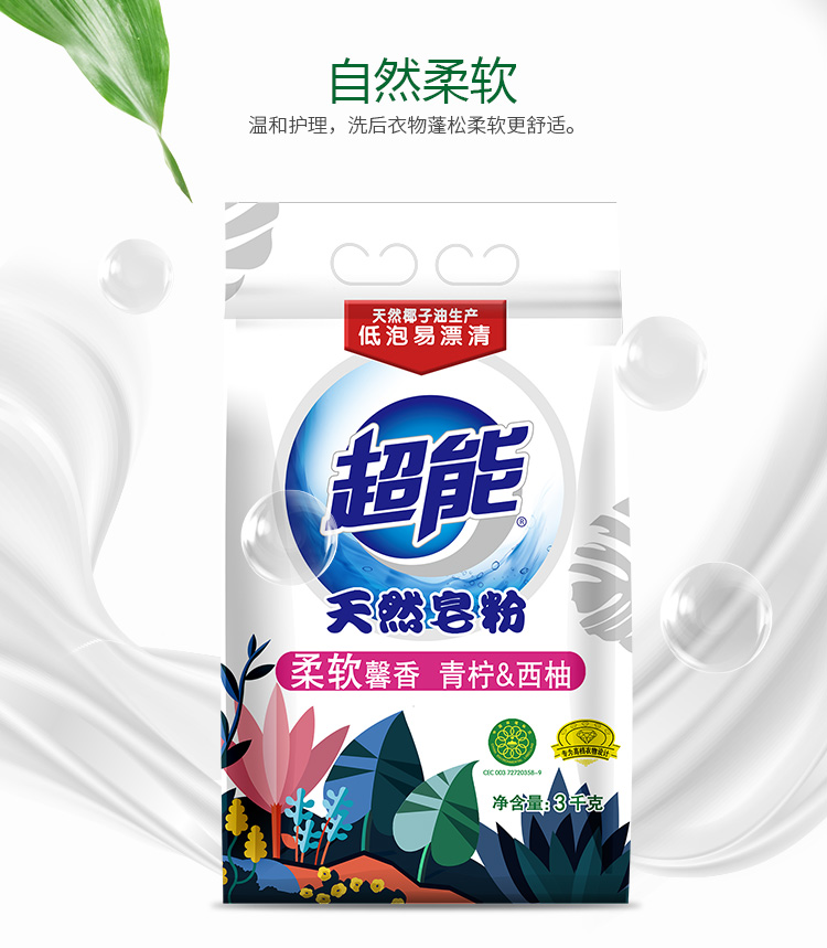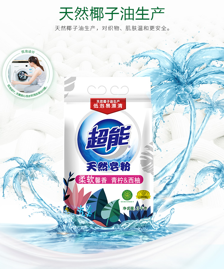 - 商品名称:超能 天然皂粉/洗衣粉(馨香柔软)3kg 天然椰油 温和无刺激 硬水适用 低泡易漂节水