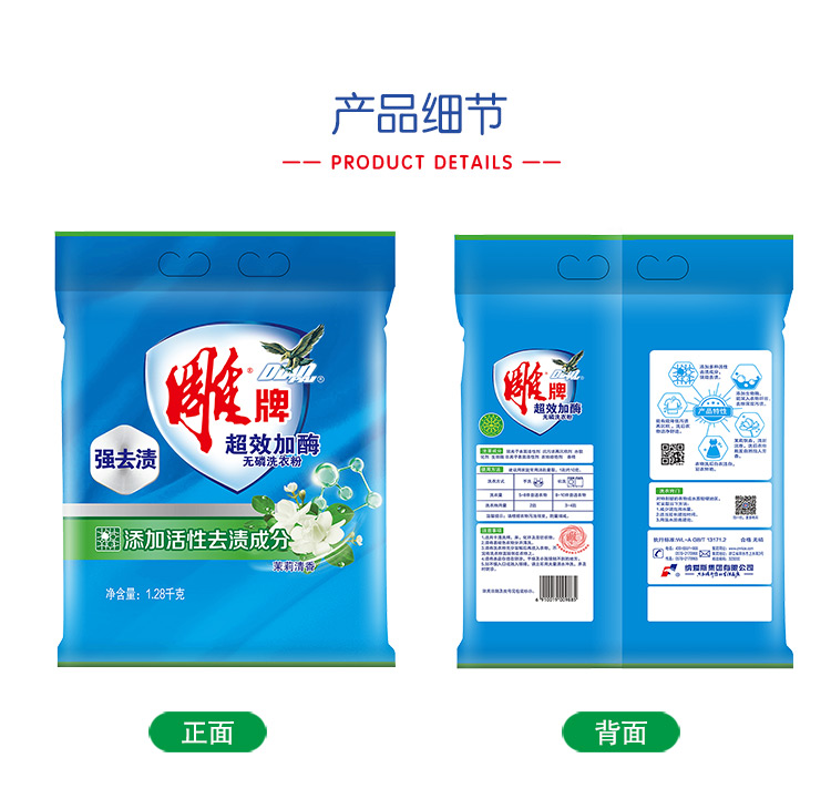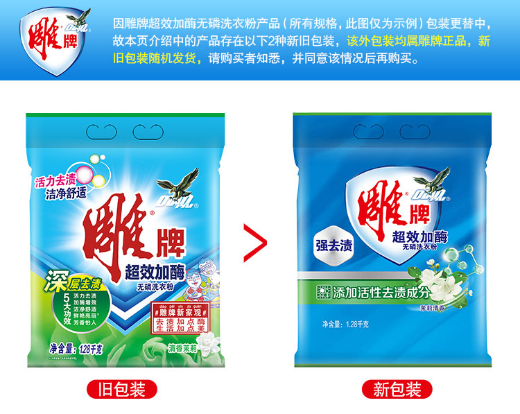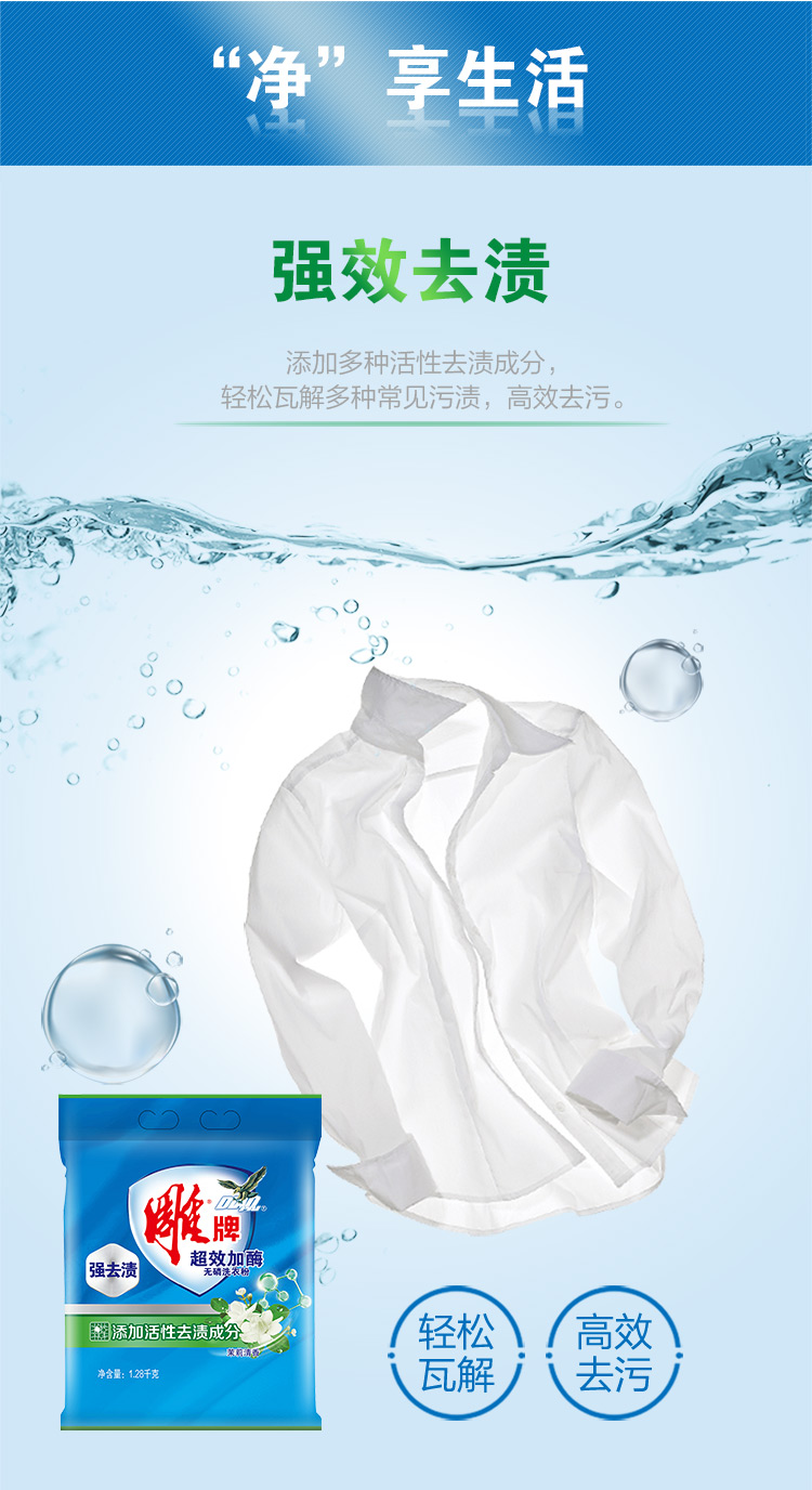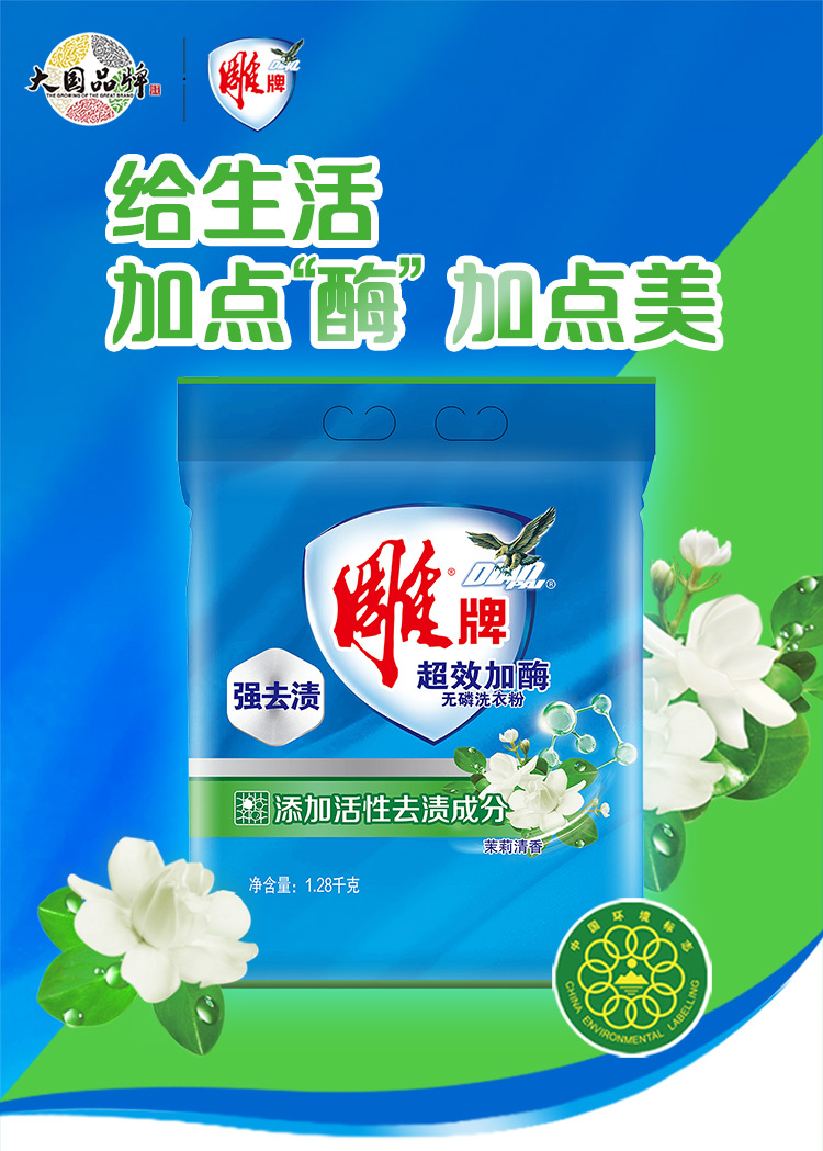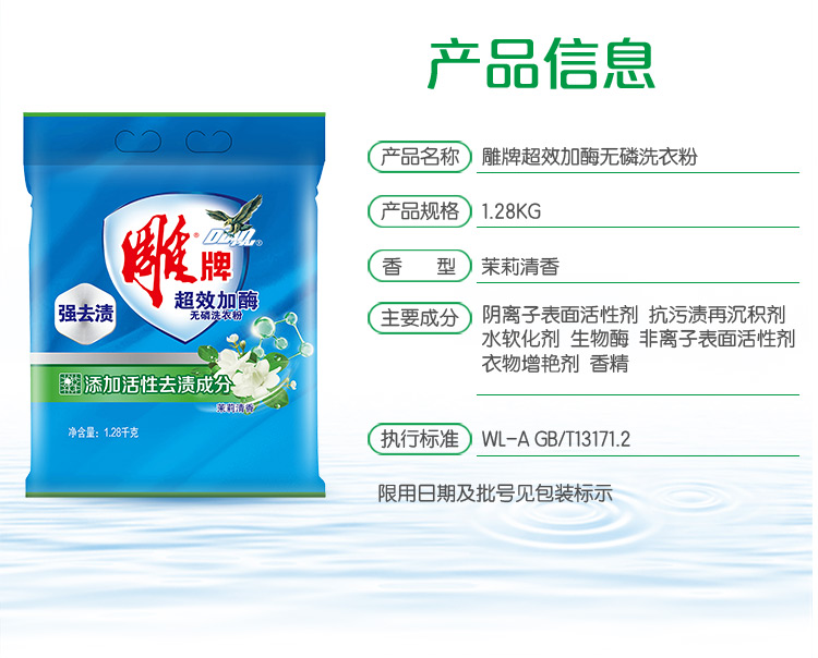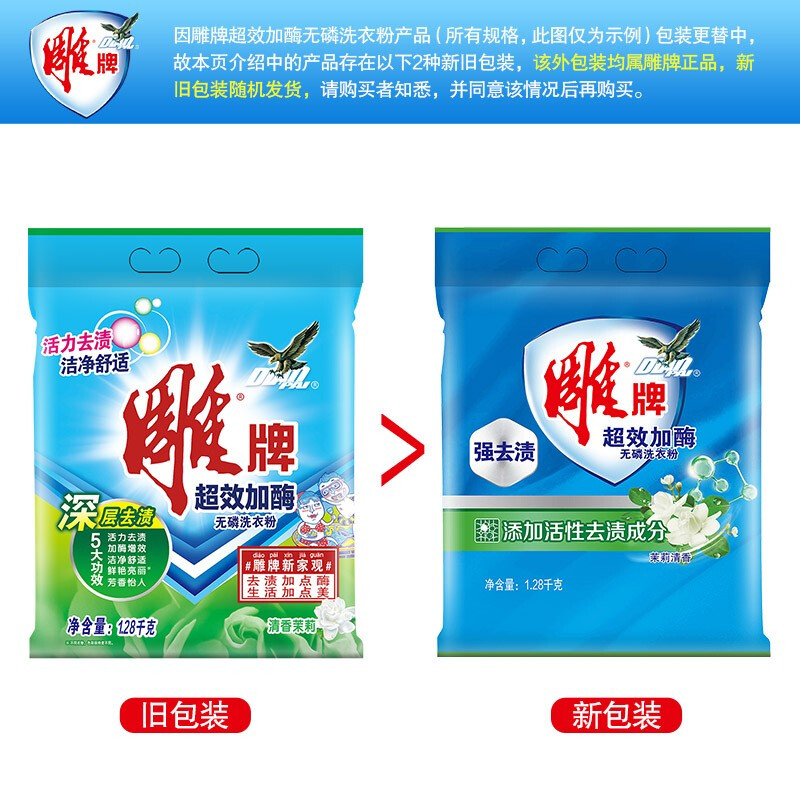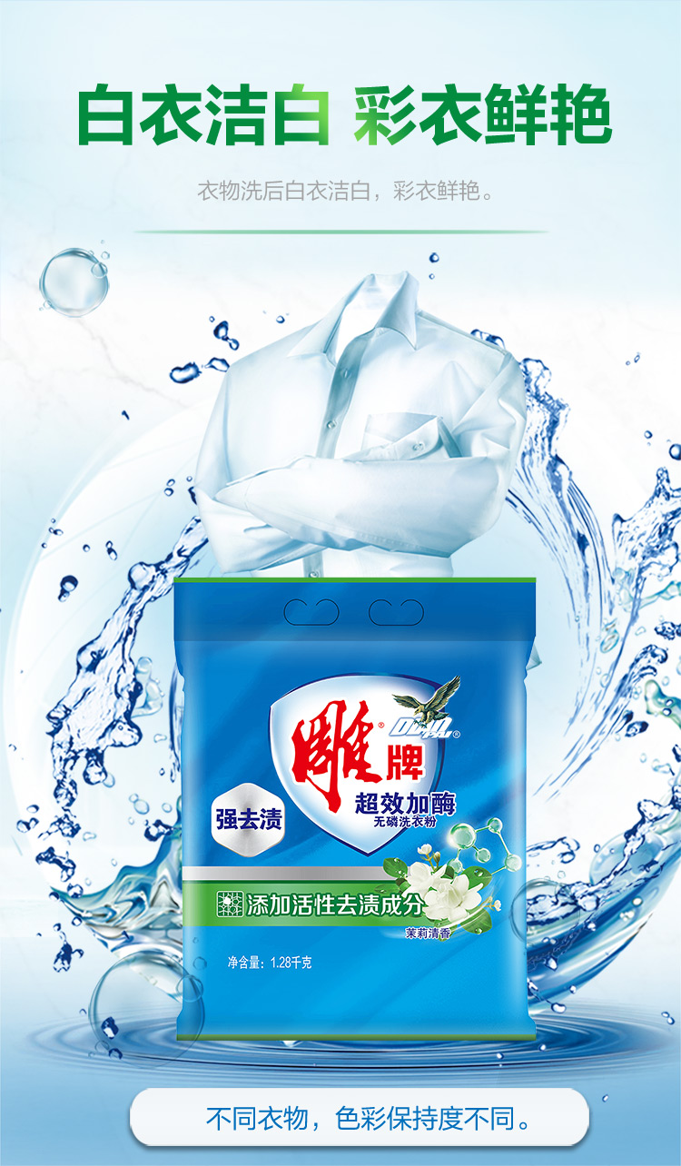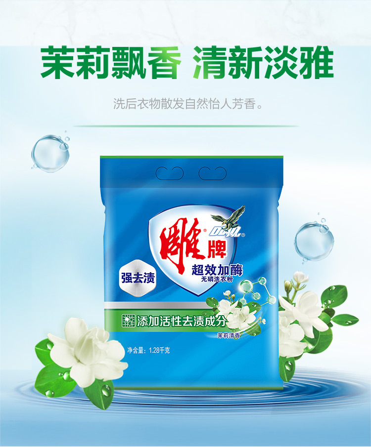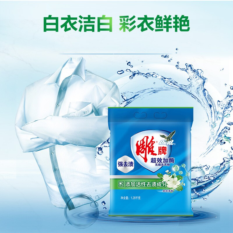 - 商品名称:雕牌 超效加酶洗衣粉1.28kg 茉莉清香 强效去渍 添加活性去渍成分 深层去污 白衣洁白 彩衣鲜艳 保持柔软