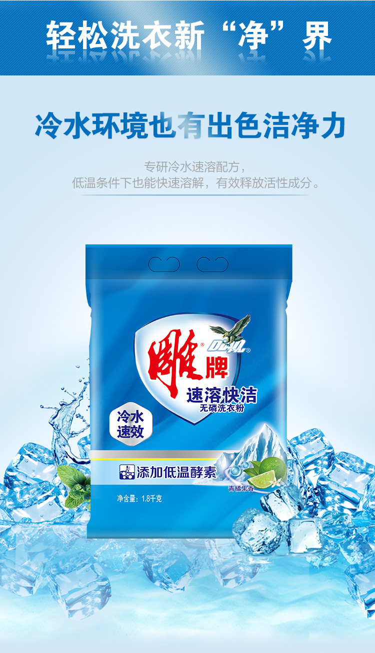 - 商品名称:雕牌 速溶快洁无磷洗衣粉1.8kg 冷水速效 青橘香型 添加低温酵素 冷硬水强去污 彩衣鲜艳(新老包装随机发)