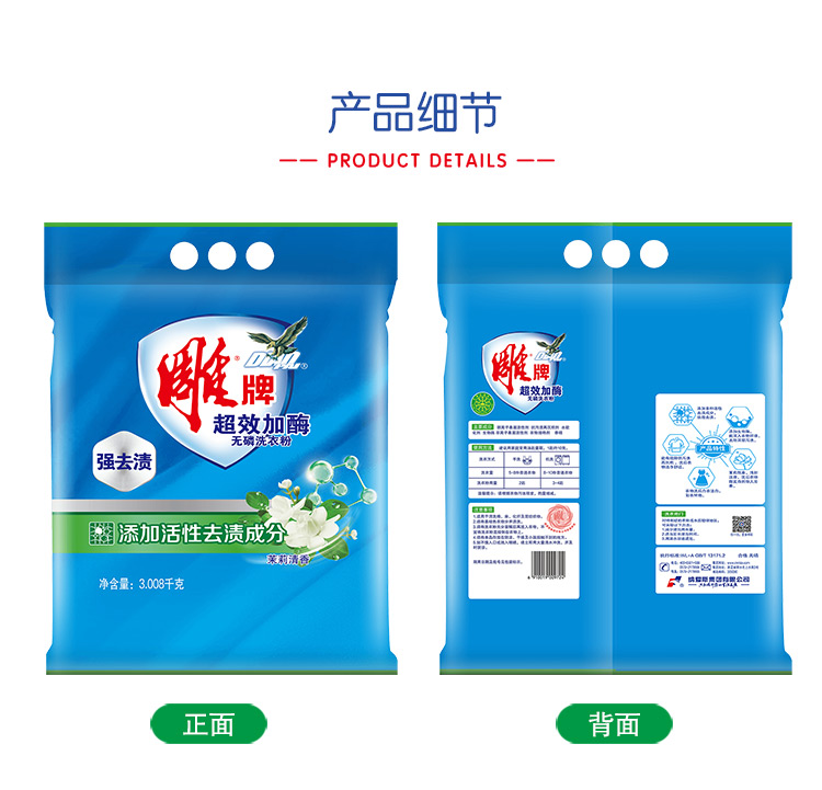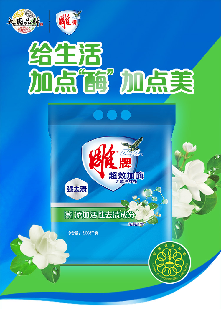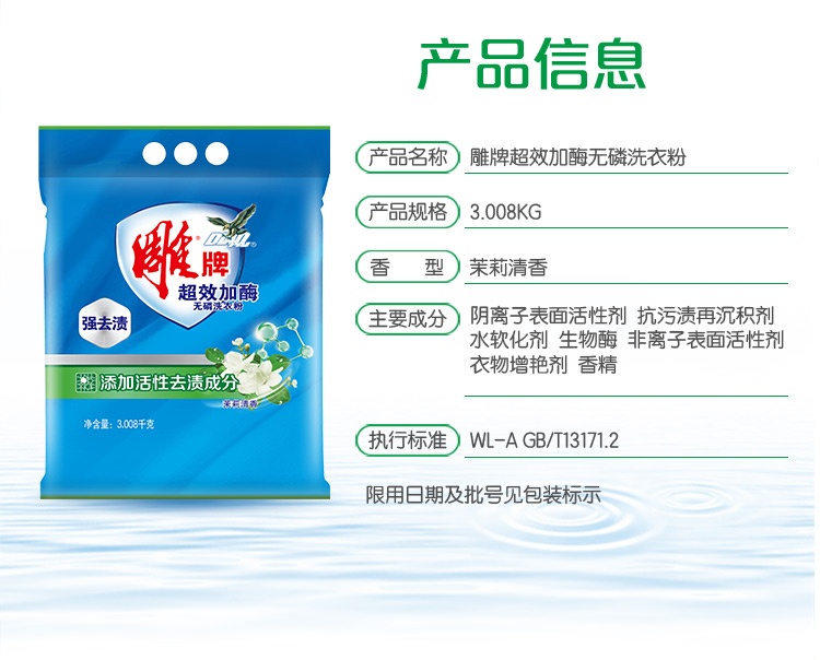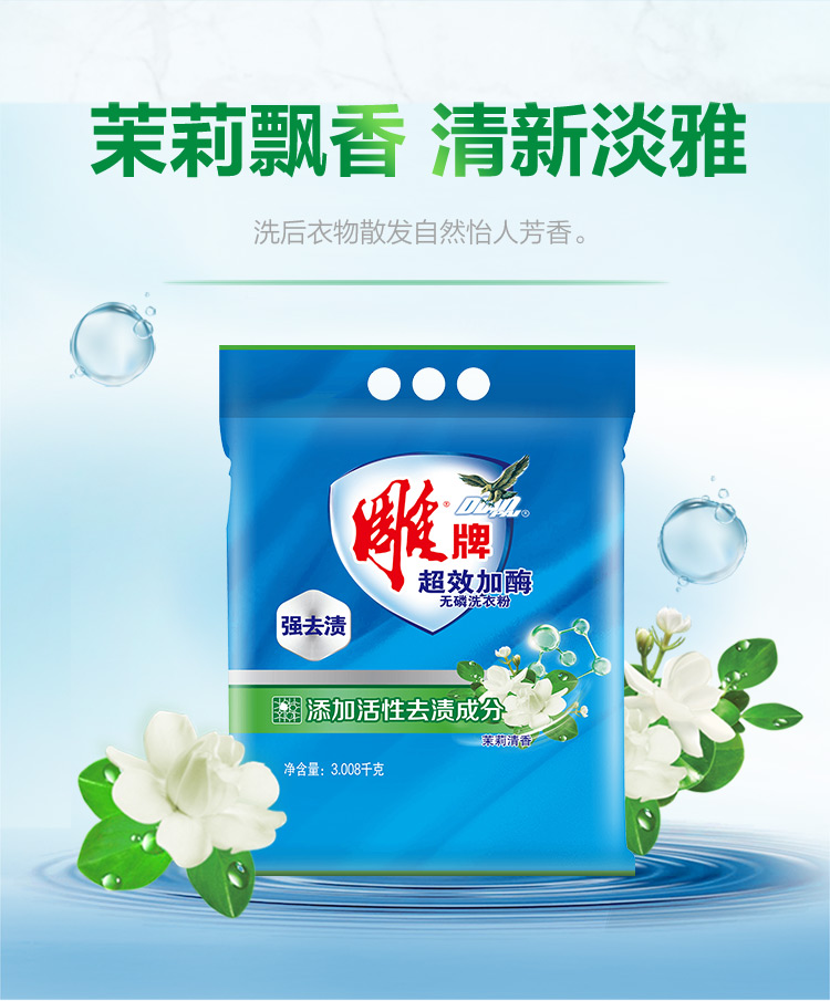 - 商品名称:雕牌 超效加酶洗衣粉3.008kg 茉莉清香 强效去渍 深层去污 白衣洁白 彩衣鲜艳(新老包装随机发)