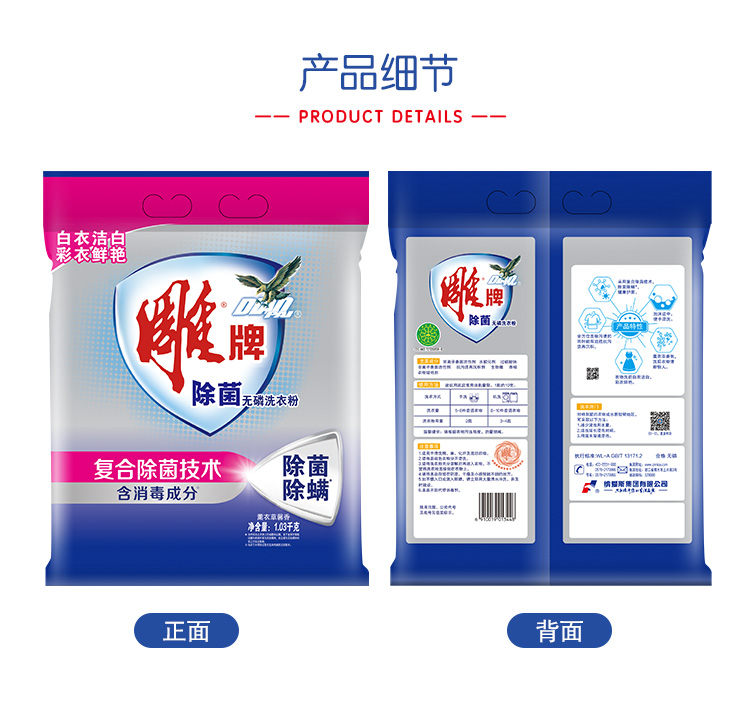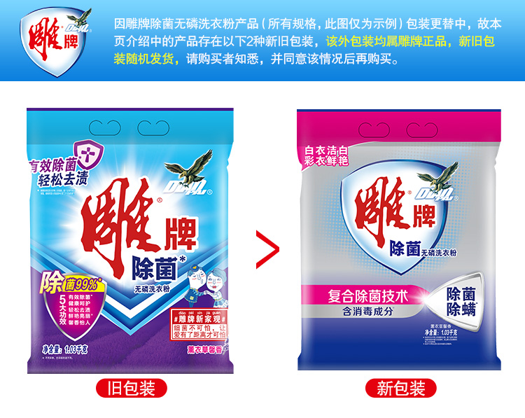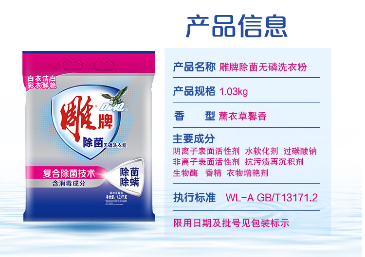 - 商品名称:雕牌 除菌无磷洗衣粉1.03kg 薰衣草香 除菌率99% 有效除菌 轻松去渍 白衣洁白 彩衣鲜艳