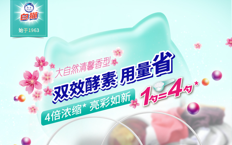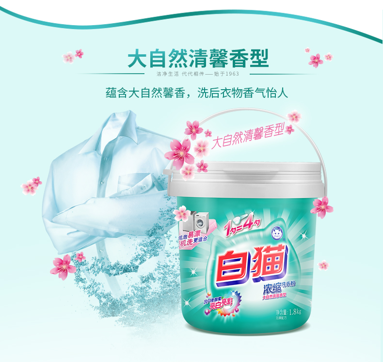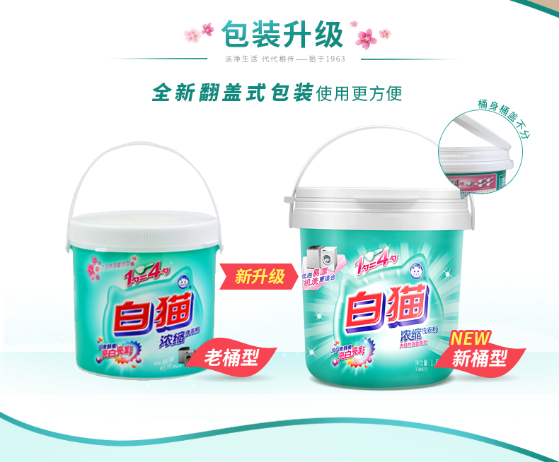 白猫 新浓缩洗衣粉1800g*6/桶 (整箱) 一勺等于四勺 丹麦进口生物酵素 翻盖式便取设计(内赠勺子)