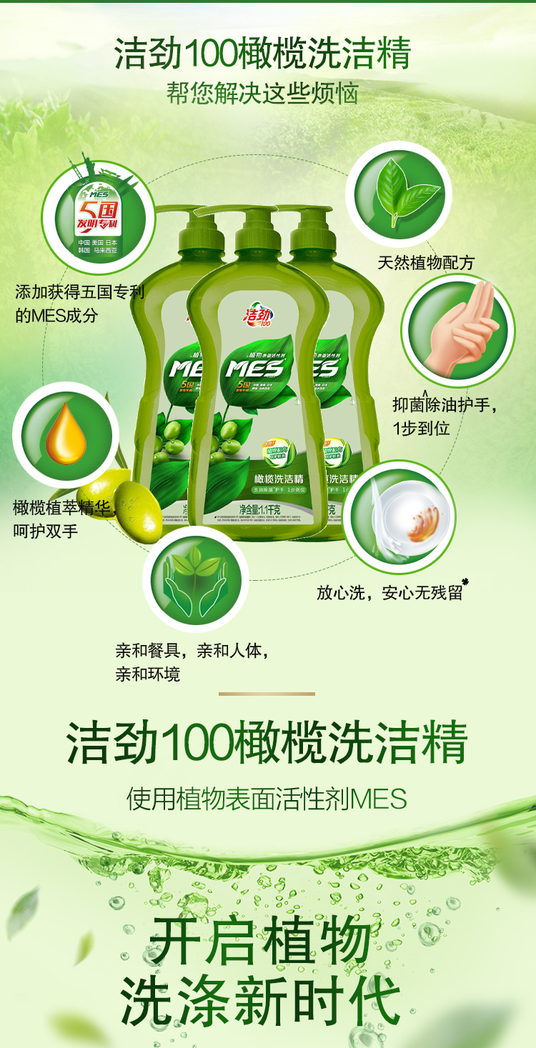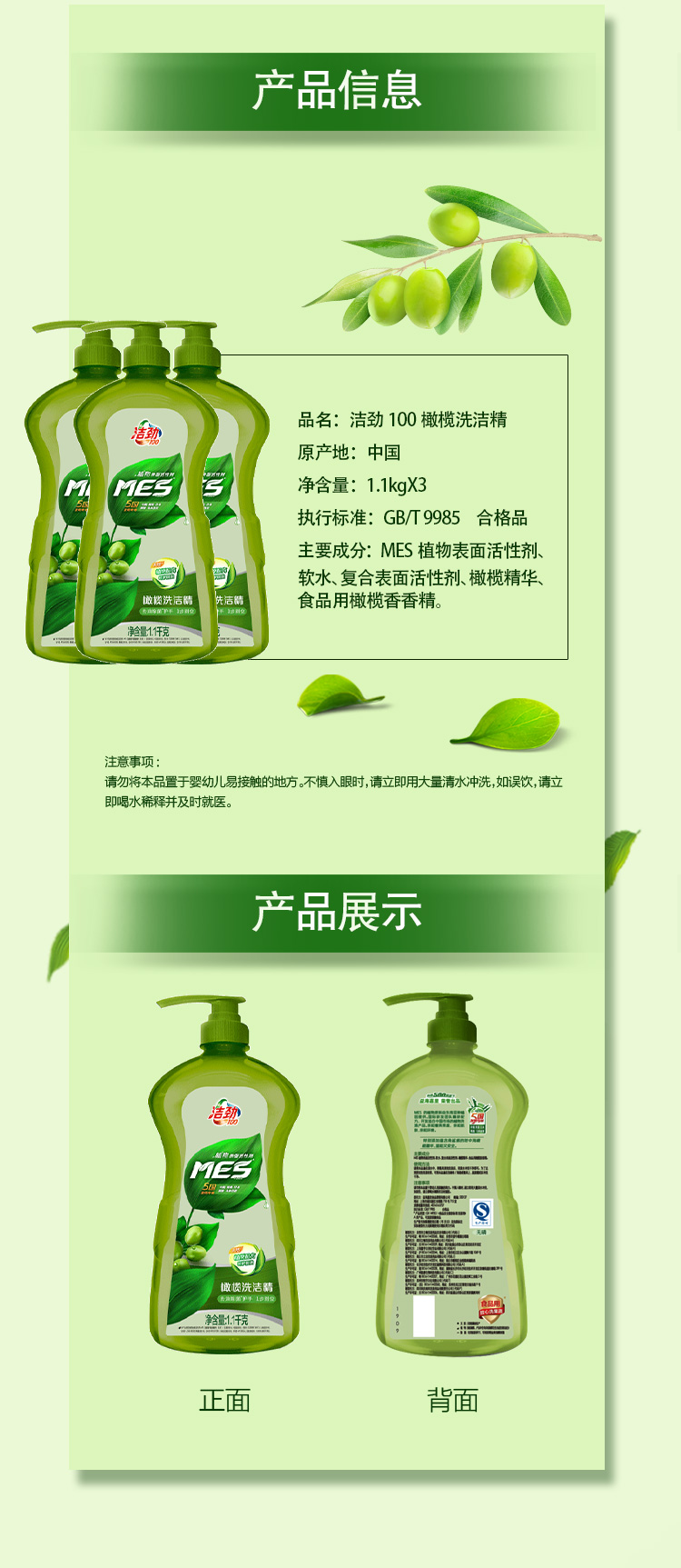- 商品名称:洁劲100 橄榄洗洁精 1.1kg*3 金龙鱼推荐 5国发明专利 MES植物表面活性剂 不伤手 果蔬净 洗碗液去油污