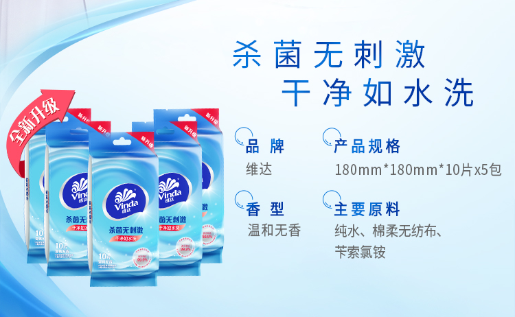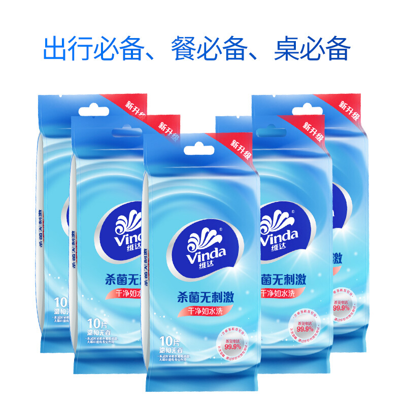 - 商品名称:维达(Vinda) 湿巾纸巾 杀菌洁肤卫生湿巾 10片独立装*5包 (量贩装)(新旧产品交替发货)细菌杀灭率达99.9%
