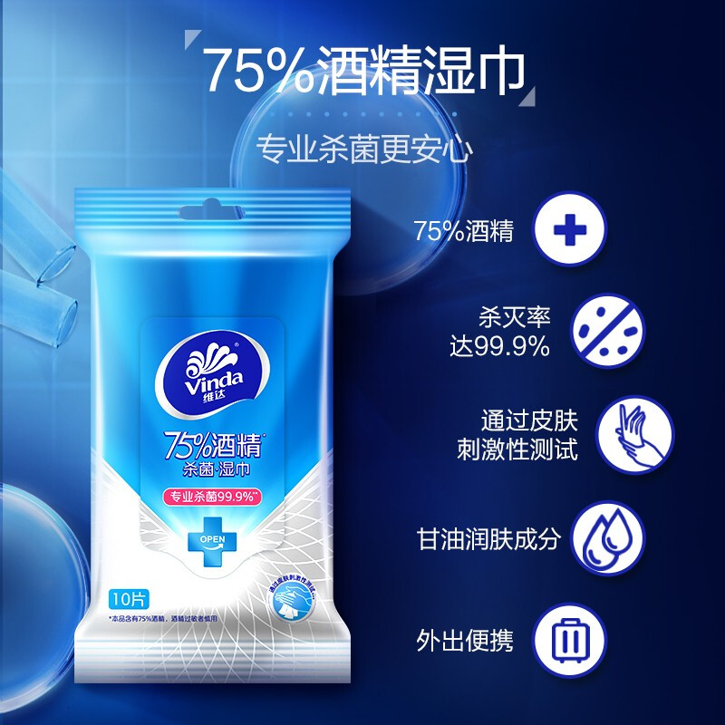 - 商品名称:维达(Vinda)湿巾湿巾 75%酒精湿去菌巾 量贩装10片*5包/提 湿纸巾 卫生湿巾