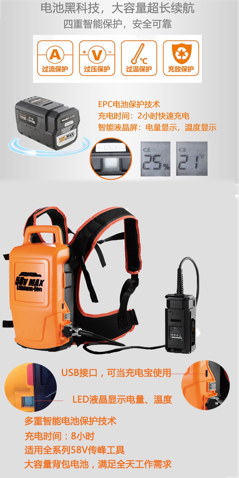 - 商品名称:传峰 58V充电式割草机大功率割灌机电动打草机 多功能开荒家用小型充电剪草机草坪机农用除草机割草神器 橙色 58V带一2AH电池一充