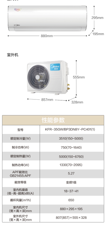 - 商品名称:美的(Midea)新能效KFR-35GW/BP3DN8Y-PC401(1) 1.5匹 一级能效 变频冷暖 空调挂机