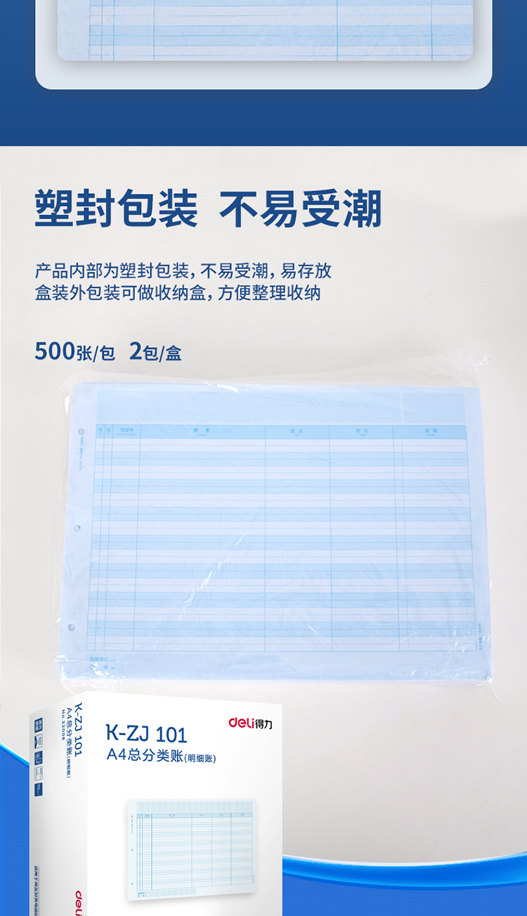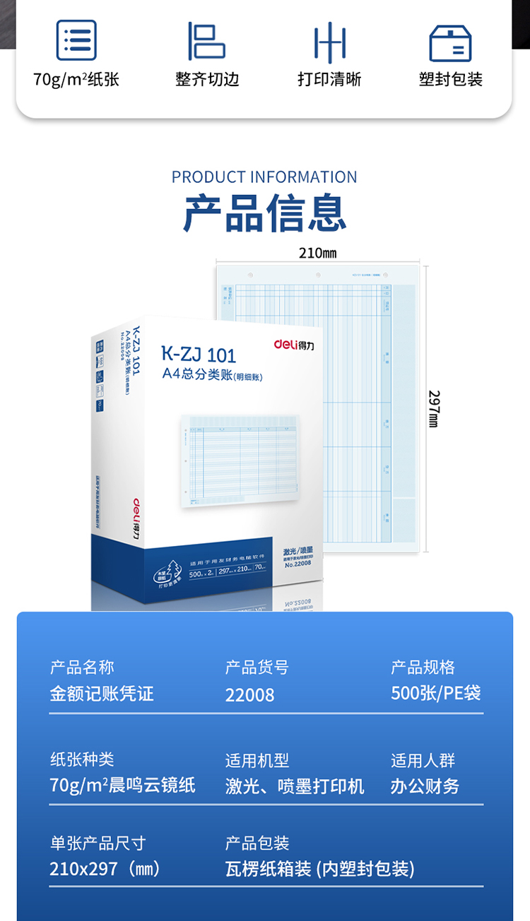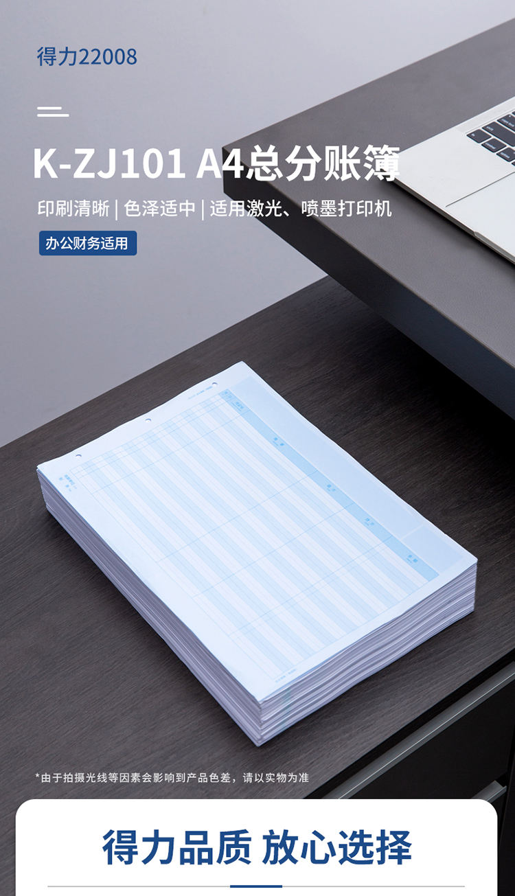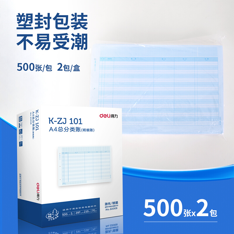 - 商品名称:得力(deli)KZJ101A4总分类账(明细账) 297*210mm 1000张/盒 好会计财务软件账本账簿凭证打印纸财务用品22008