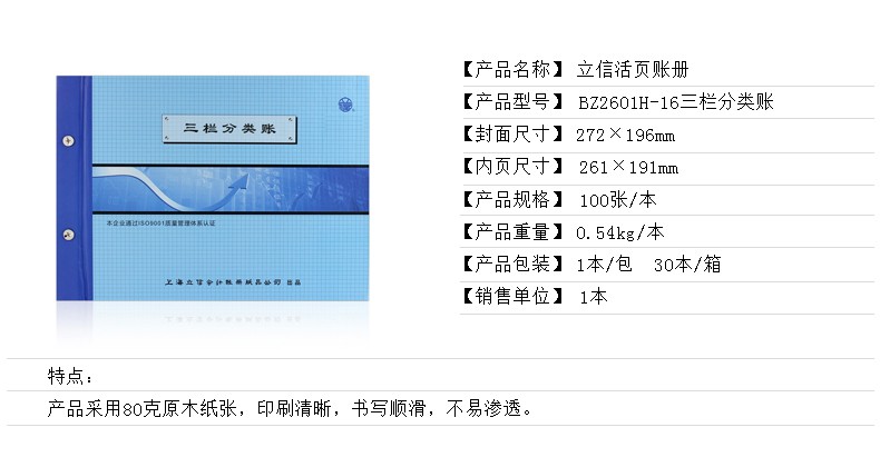 商品名称:上海立信三栏分类账本多栏式明细账 记账本 活页账本账册100张/本(借贷式)含封面 BZ2601H