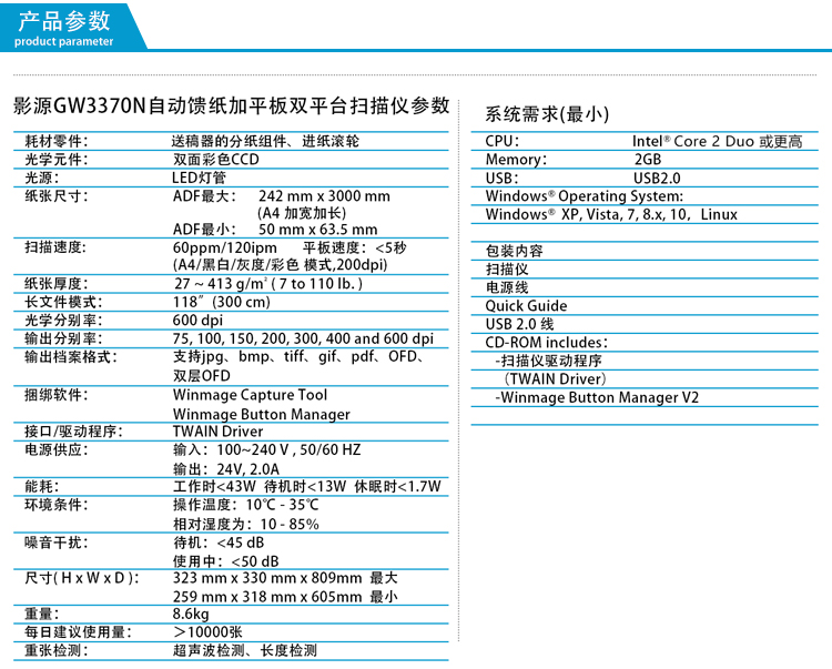 - 商品名称:影源GW3370N高速文档扫描仪