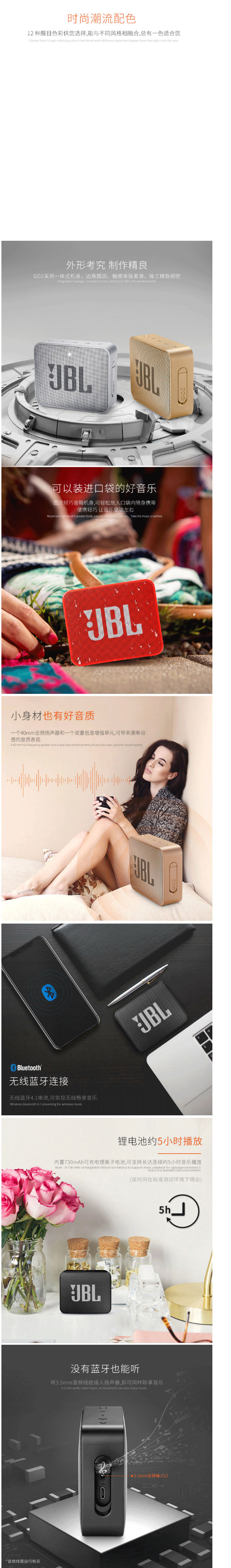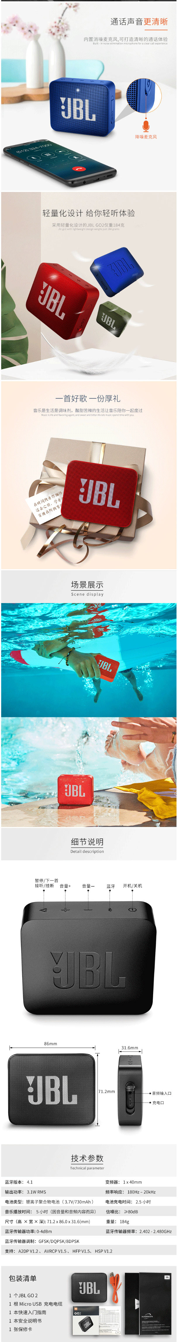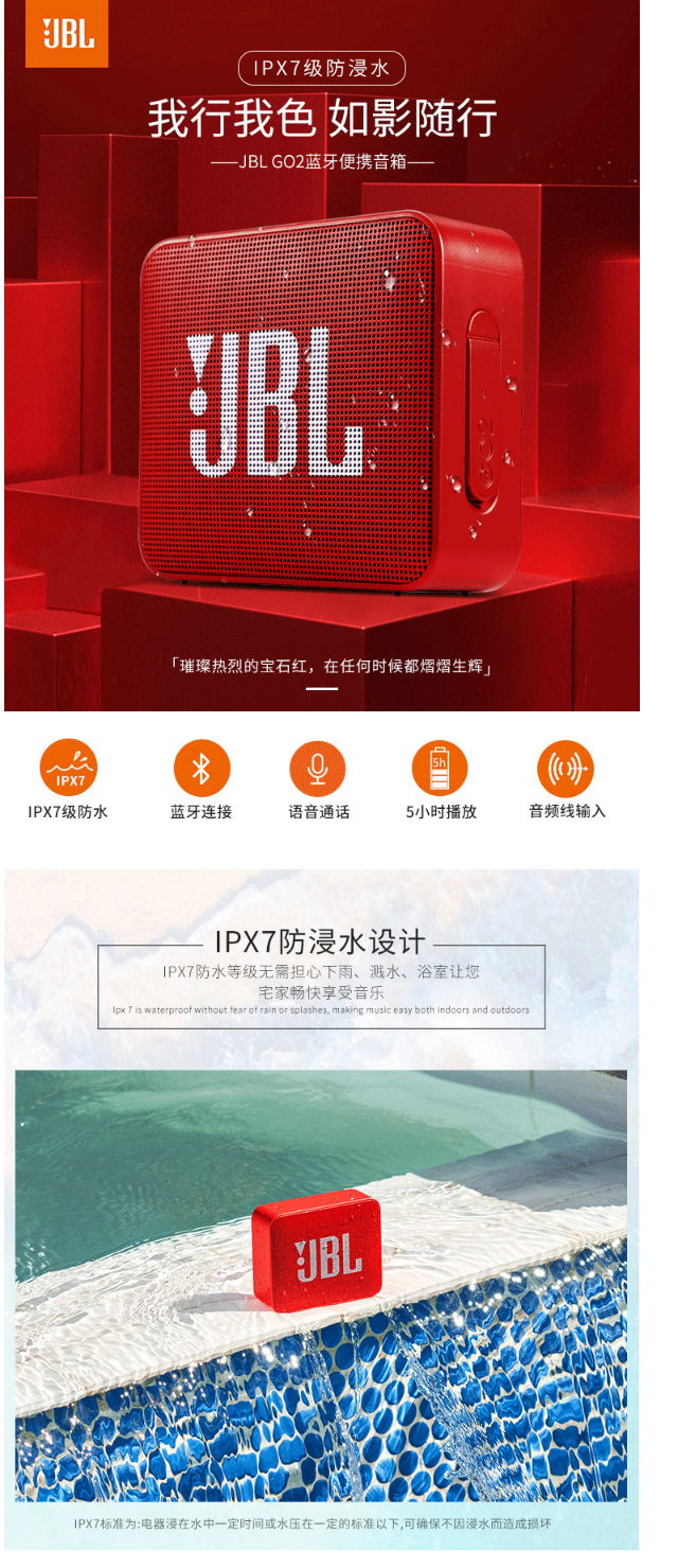 商品名称:JBL GO2 音乐金砖二代 便携式蓝牙音箱 低音炮 户外音箱 迷你小音响 可免提通话 防水设计 宝石红