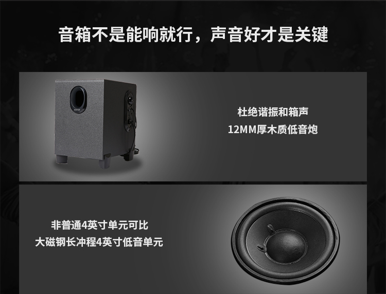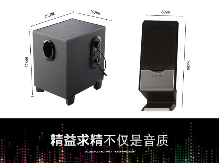 - 产品尺寸(mm):低音箱箱体 162 x 226 x 206mm 卫星箱箱体 68 x 166 x 86mm
