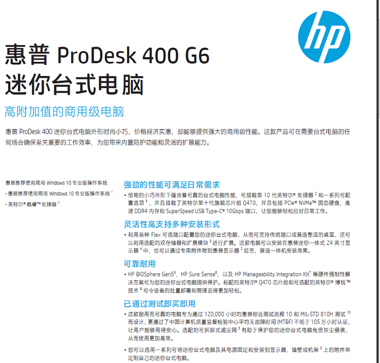 - 商品名称:HP ProDesk 400 G6 DM 21.5" 1升超小机箱 支持背挂于显示器 含PCIe固态硬盘台式机 i5 10500T 8G 固态硬盘256GB SSD 集成显卡 硬盘保护、网络同传 21.5英寸液晶 DOS 原厂三年质保