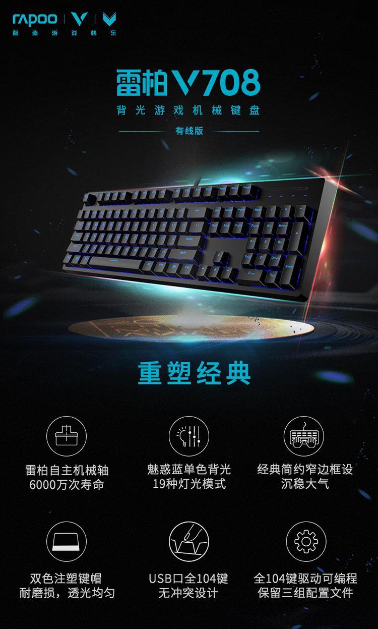 - 商品名称:雷柏(Rapoo) V708有线版 机械键盘 有线键盘 游戏键盘 104键单光键盘 可自定义编程 电脑键盘 红轴