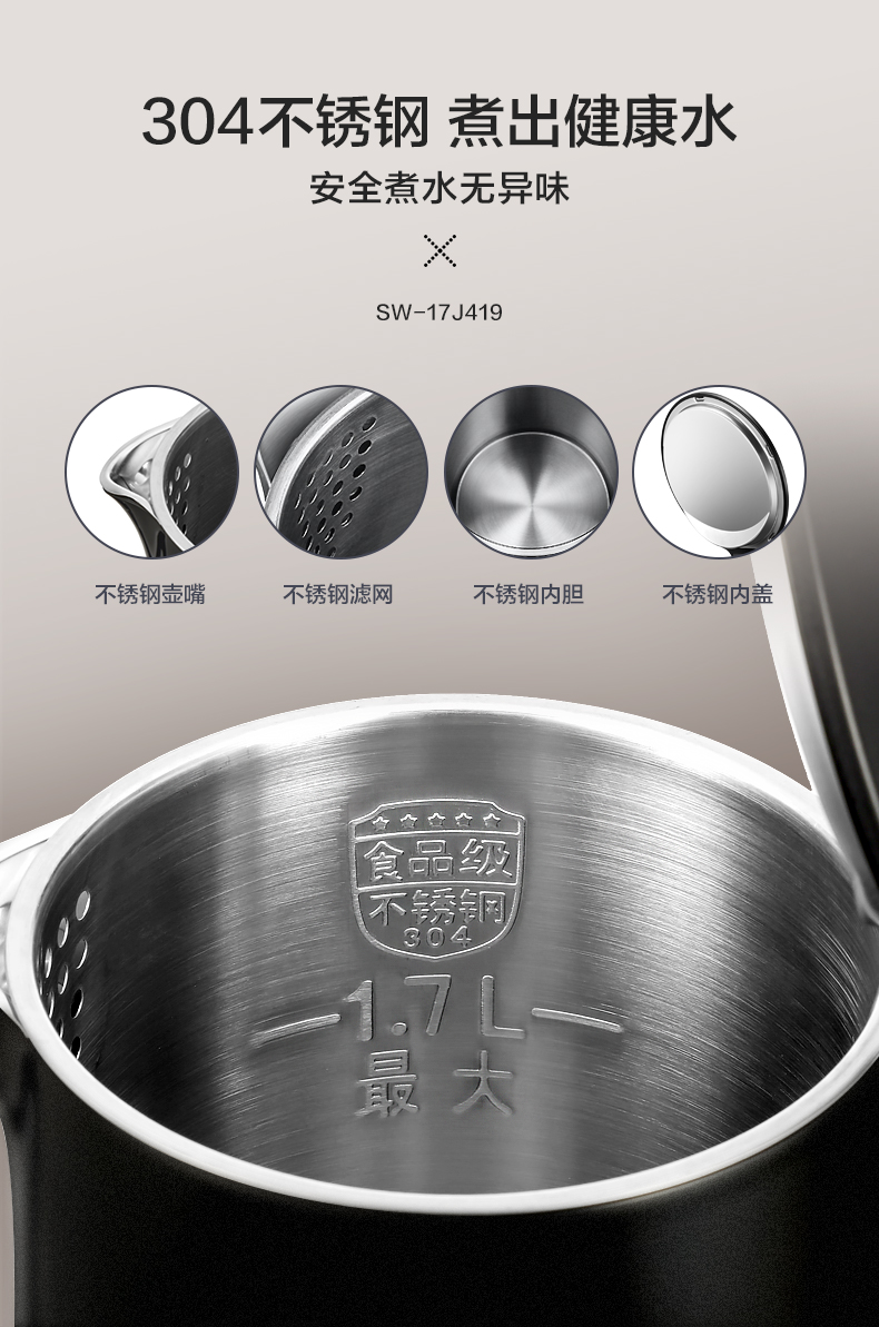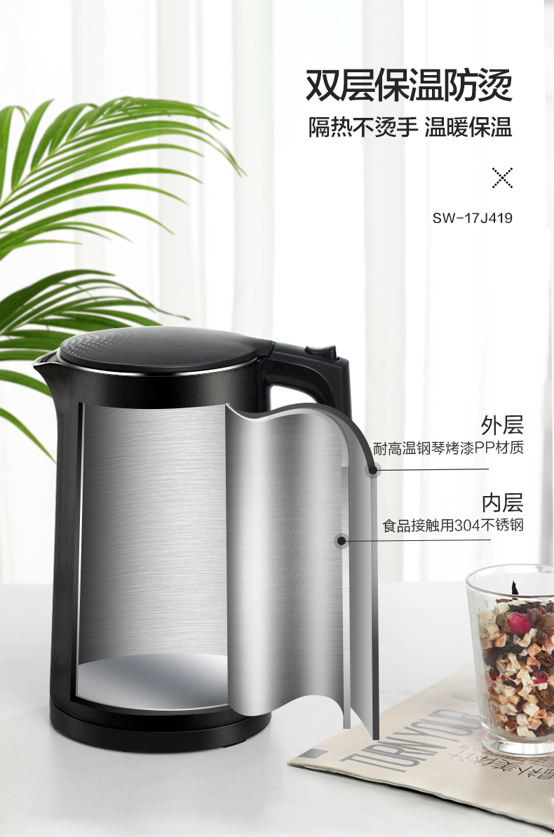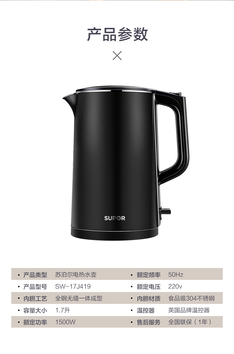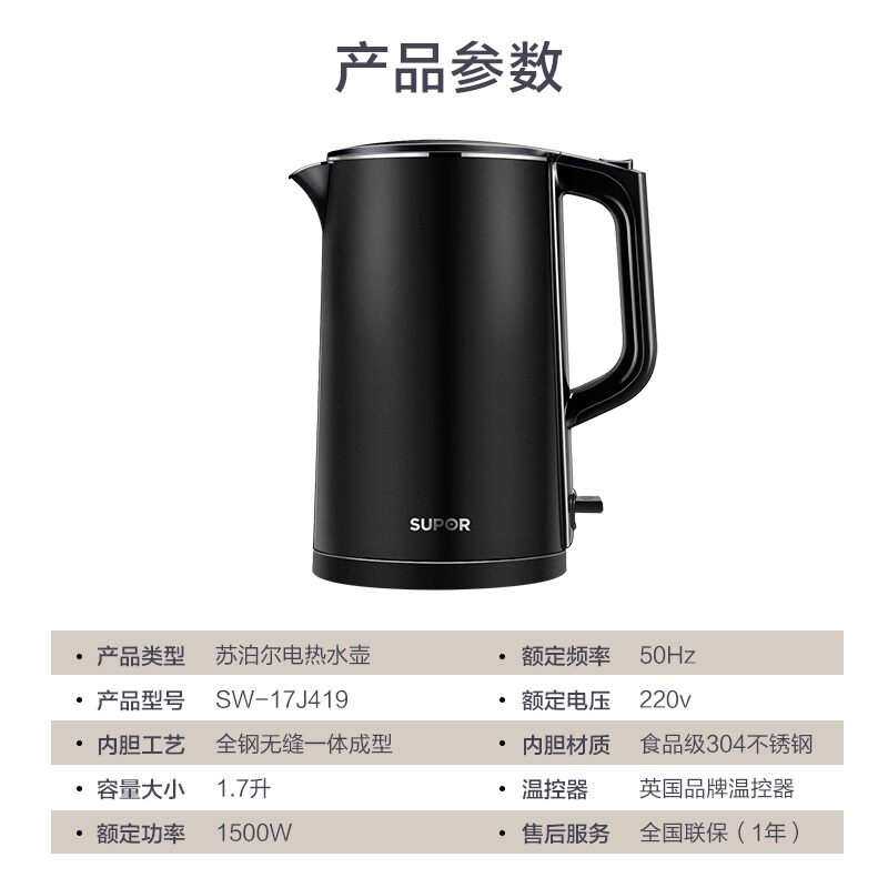 - 商品名称:苏泊尔(SUPOR)电水壶 双层防烫烧水壶热水壶 全钢无缝内胆电热水壶SW-17J419 1.7L大容量
