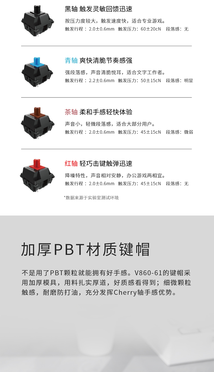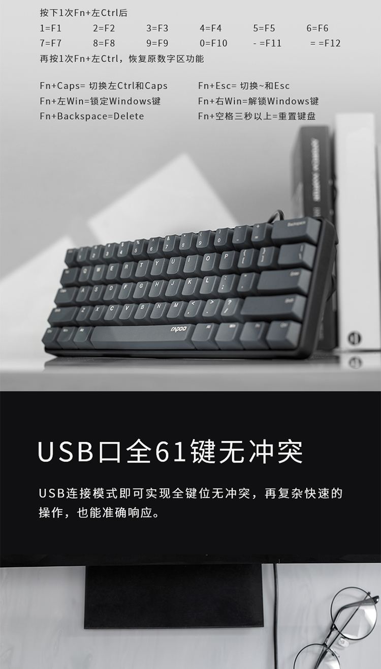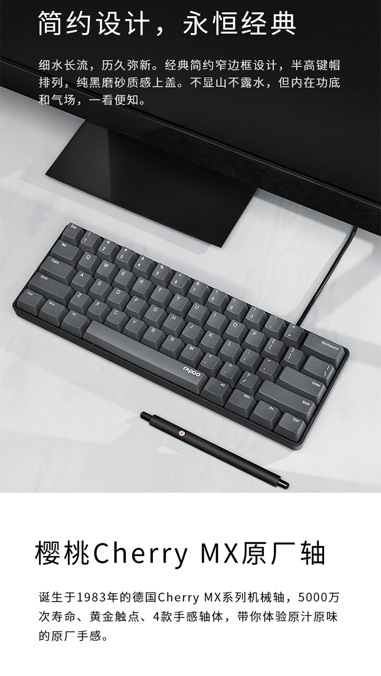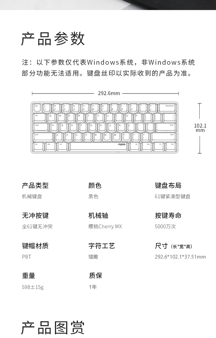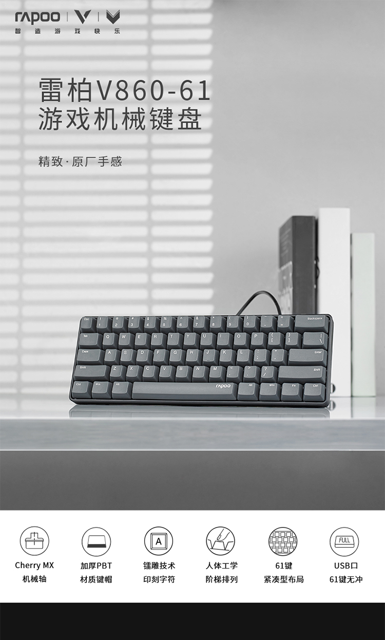 - 商品名称:雷柏(Rapoo) V860 机械键盘 有线键盘 游戏键盘 61键 原厂Cherry轴 吃鸡键盘 黑色 樱桃黑轴
