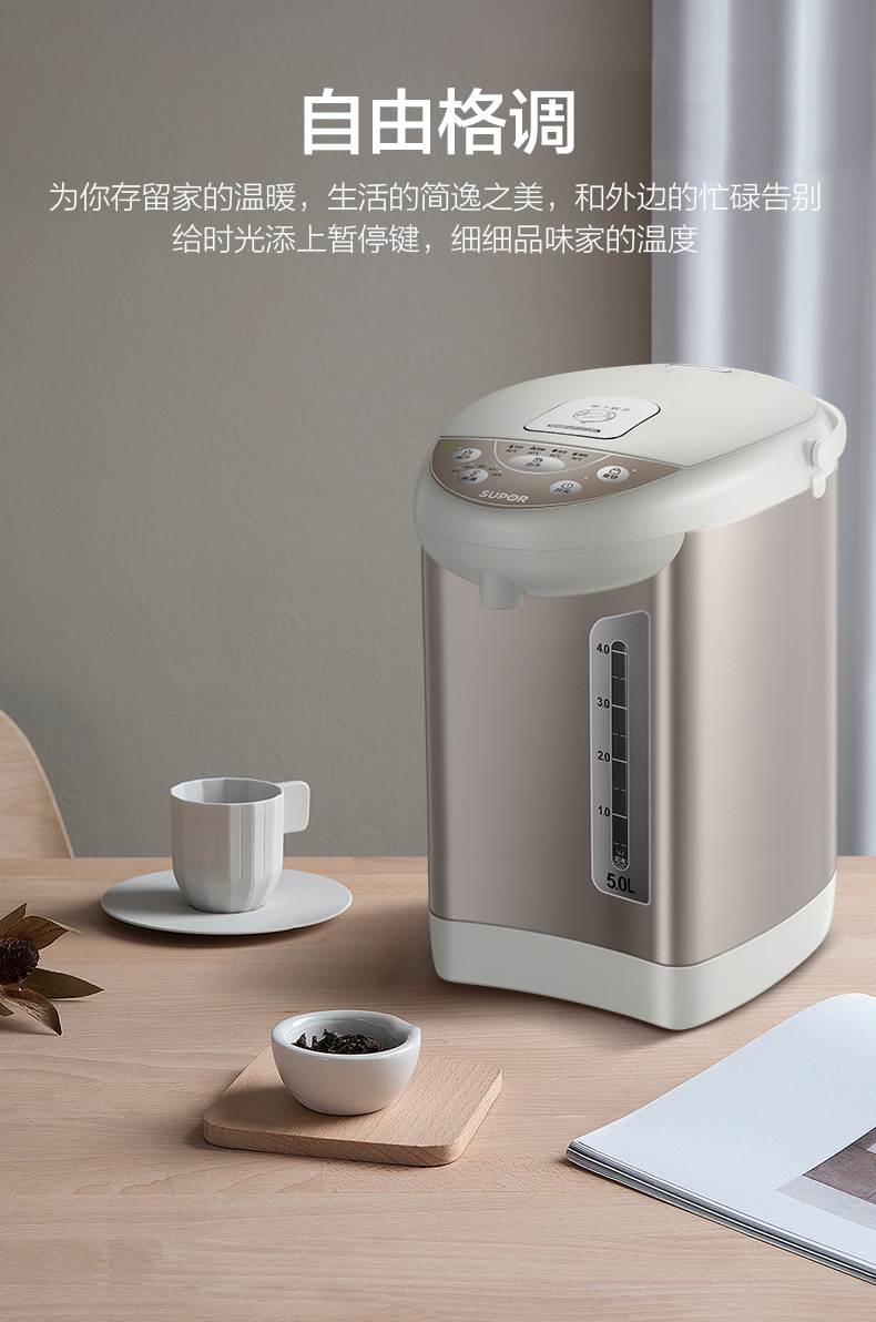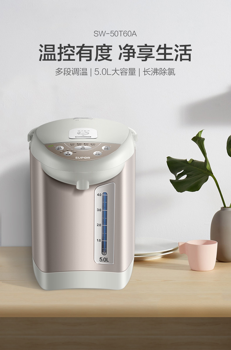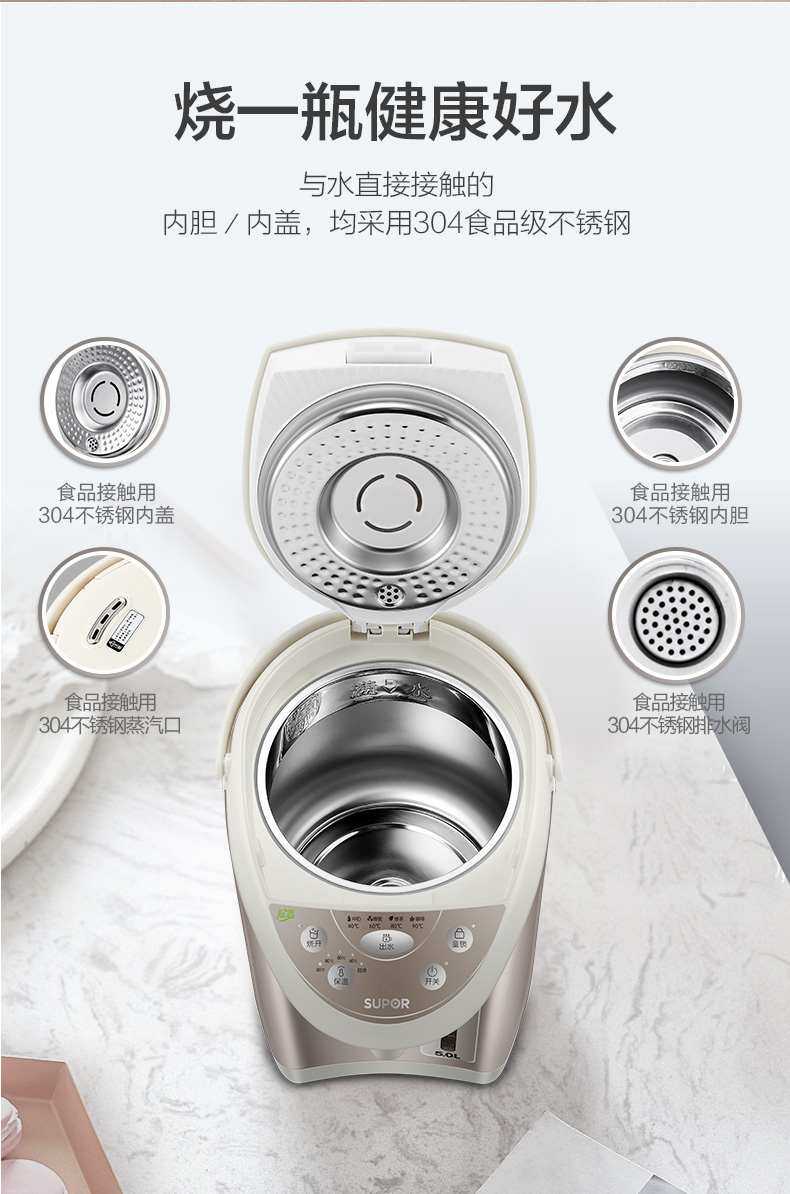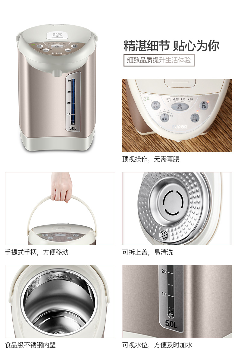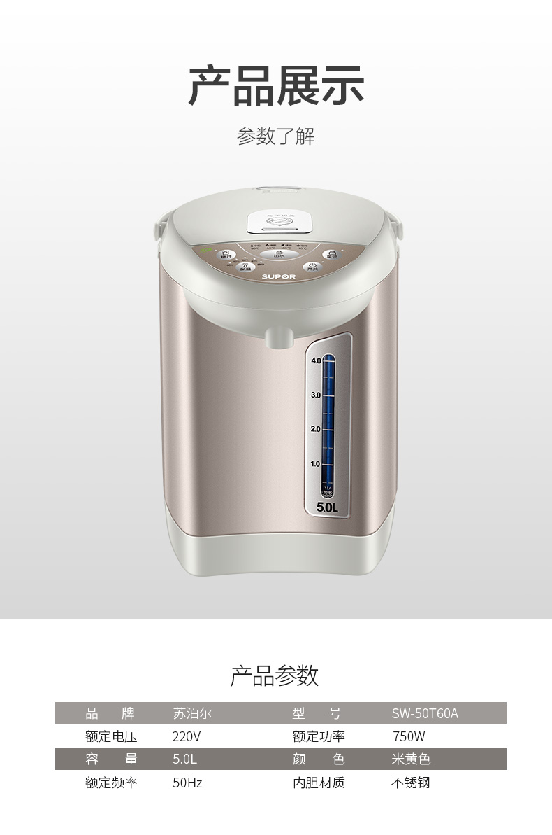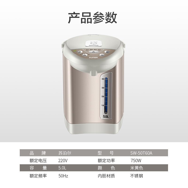 - 商品名称:苏泊尔(SUPOR)电热水瓶 电热水壶烧水壶 5L容量 多段温控电水壶 双层防烫 304不锈钢开水壶 SW-50T60A