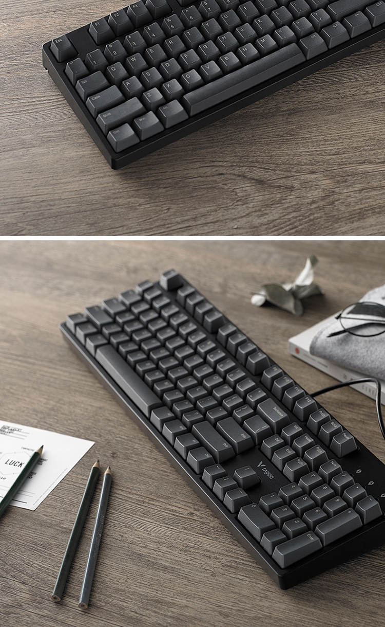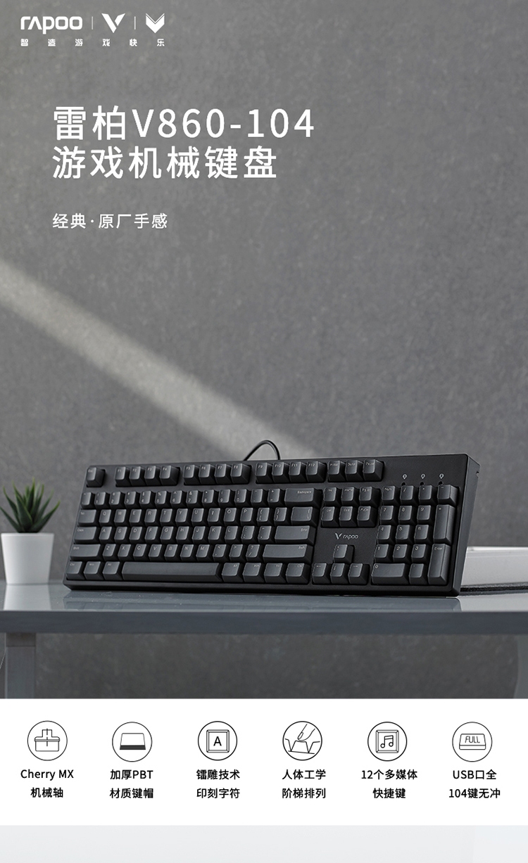 雷柏(Rapoo) V860 机械键盘 有线键盘 游戏键盘 104键 原厂Cherry轴 吃鸡键盘 黑色 樱桃黑轴