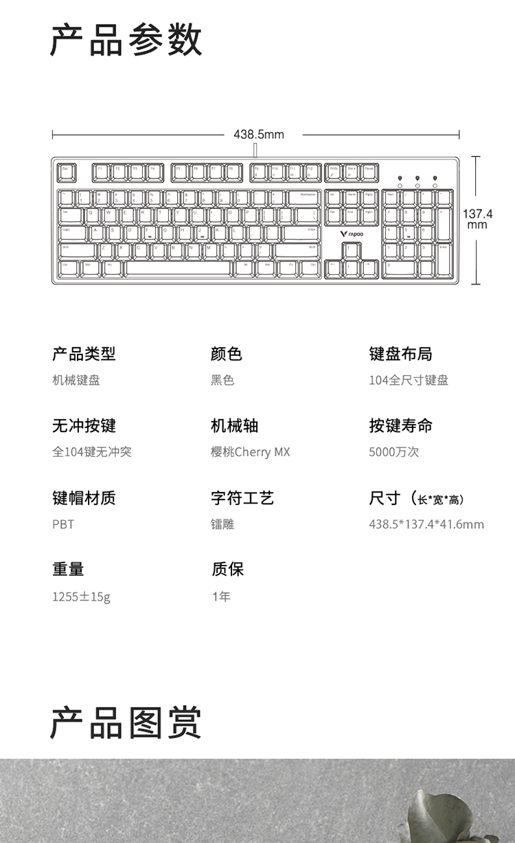 商品名称:雷柏(Rapoo) V860 机械键盘 有线键盘 游戏键盘 104键 原厂Cherry轴 吃鸡键盘 黑色 樱桃黑轴
