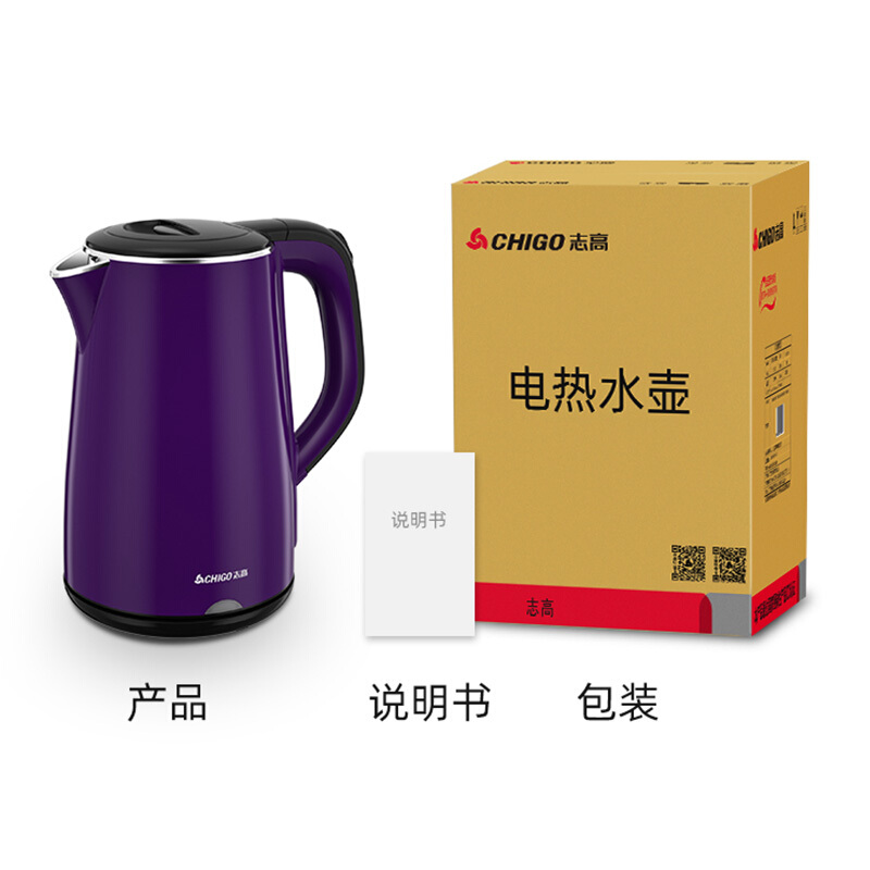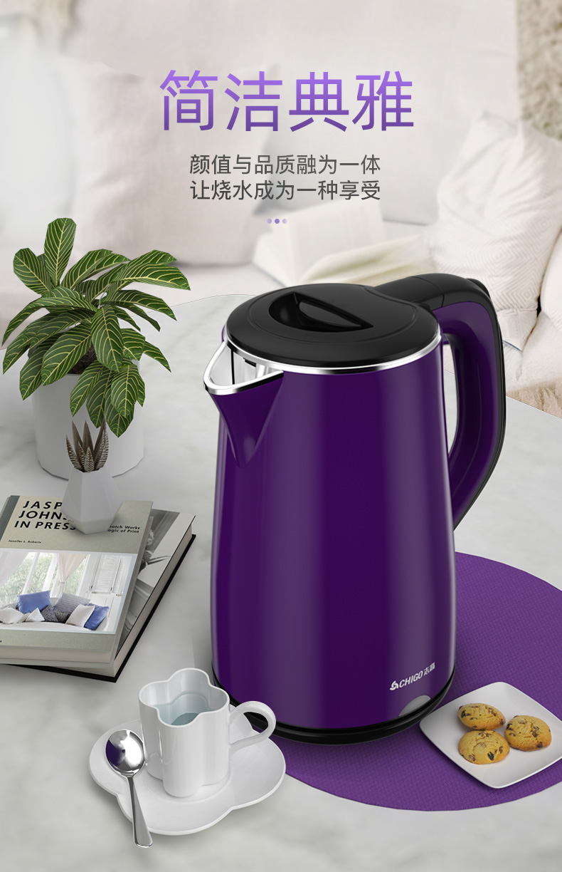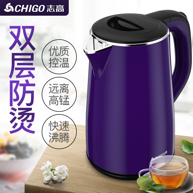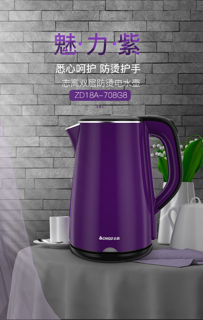 志高(CHIGO)电水壶烧水壶电热水壶 304不锈钢双层防烫 1.8L容量 ZD18A-708G8 紫色