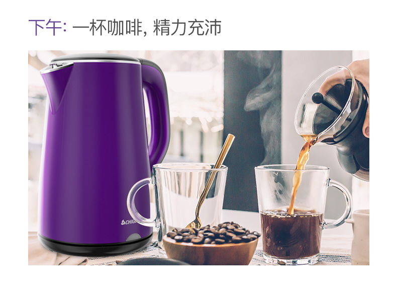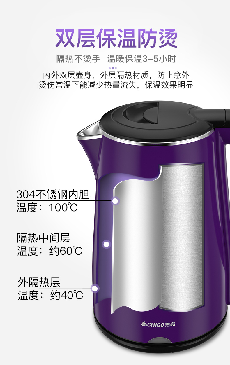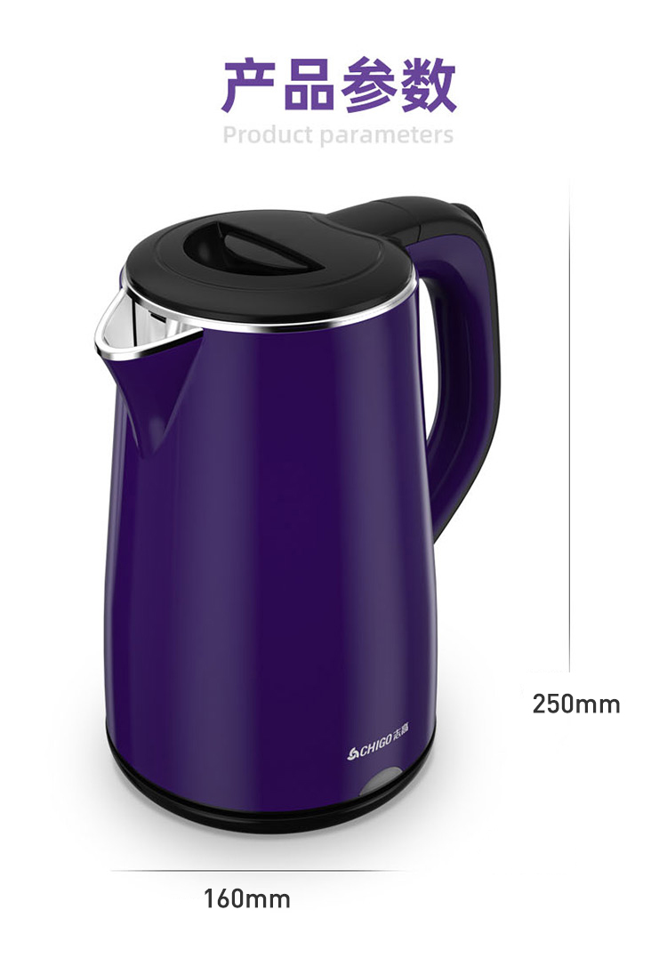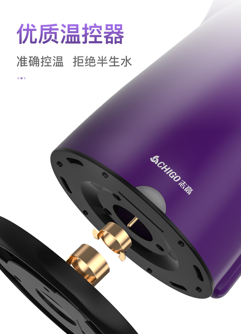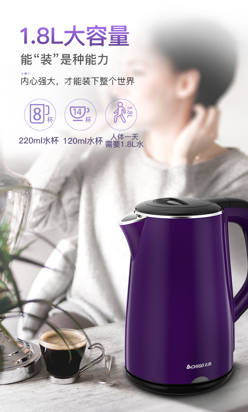志高(CHIGO)电水壶烧水壶电热水壶 304不锈钢双层防烫 1.8L容量 ZD18A-708G8 紫色