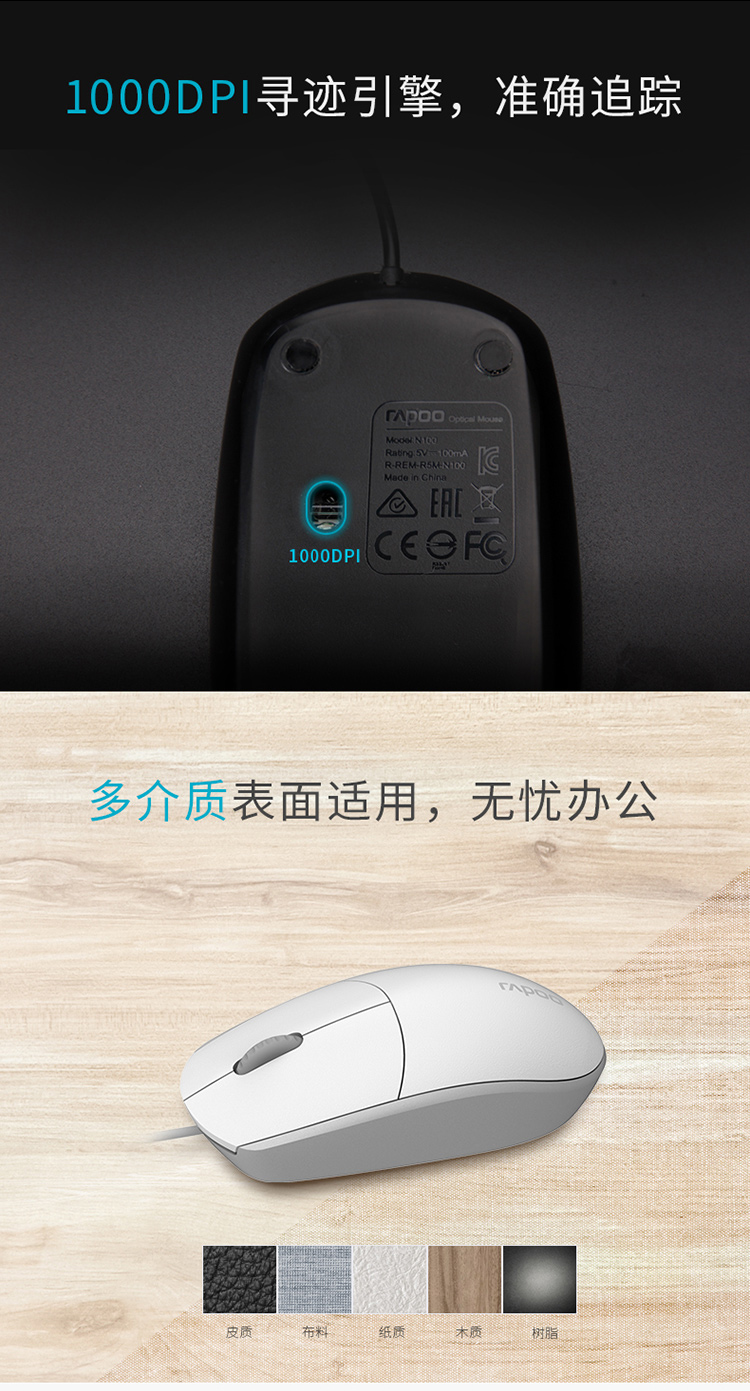 雷柏(Rapoo) N1200S 有线鼠标 办公鼠标 对称鼠标 笔记本鼠标 电脑鼠标 台式机鼠标 白色