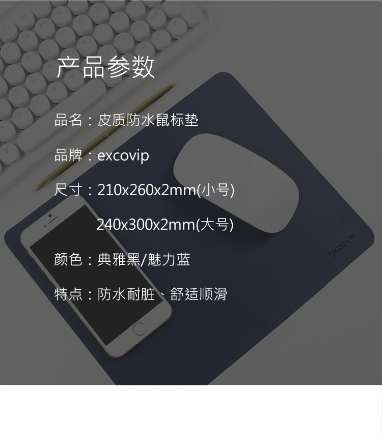 - 商品名称:宜适酷(EXCO)防水皮质鼠标垫小号办公桌垫单面游戏垫 典雅黑BAS1801-08