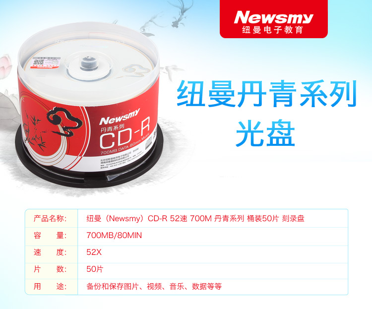 商品名称:纽曼(Newsmy)CD-R光盘/刻录盘 丹青系列 52速700M 桶装50片空白光盘