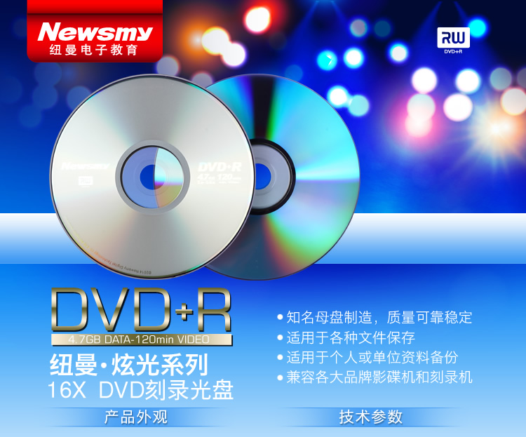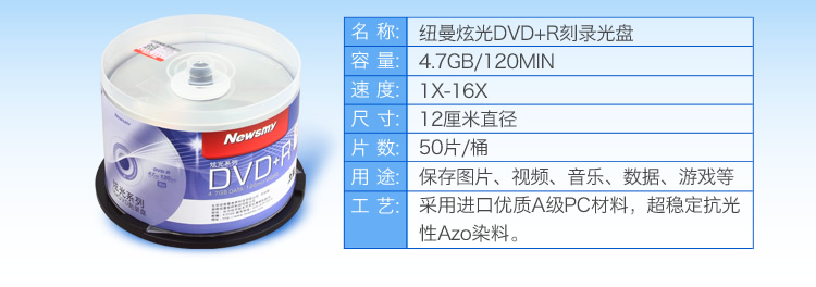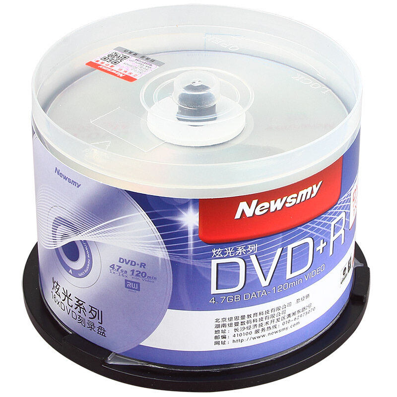 商品名称:纽曼(Newsmy)DVD+R光盘/刻录盘 炫光系列 16速4.7G 桶装50片