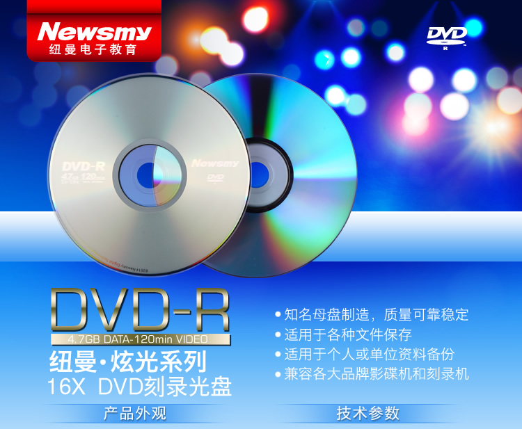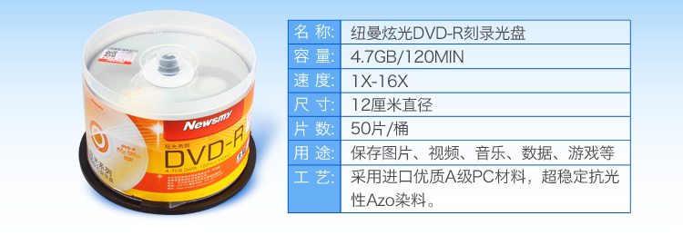 - 商品名称:纽曼(Newsmy)DVD-R空白光盘/刻录盘 炫光系列 16速4.7G 桶装50片