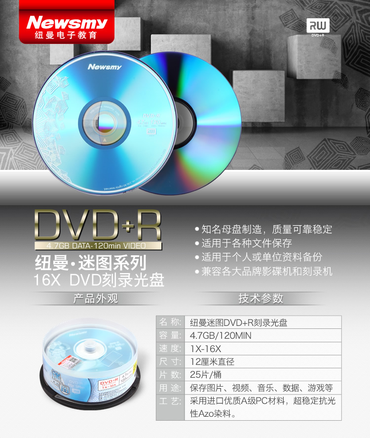 - 名称:纽曼(Newsmy)DVD+R 16速 4.7G迷途系列光盘 桶装25片 空白刻录光盘-新老包装随机发货