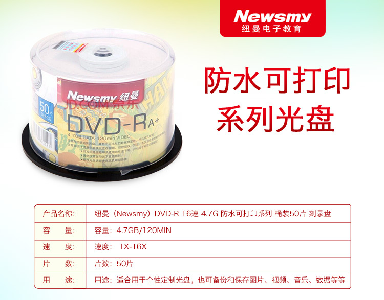 - 商品名称:纽曼(Newsmy)DVD-R空白光盘/刻录碟片 16速4.7G 防水可打印系列 桶装DVD刻录盘50片