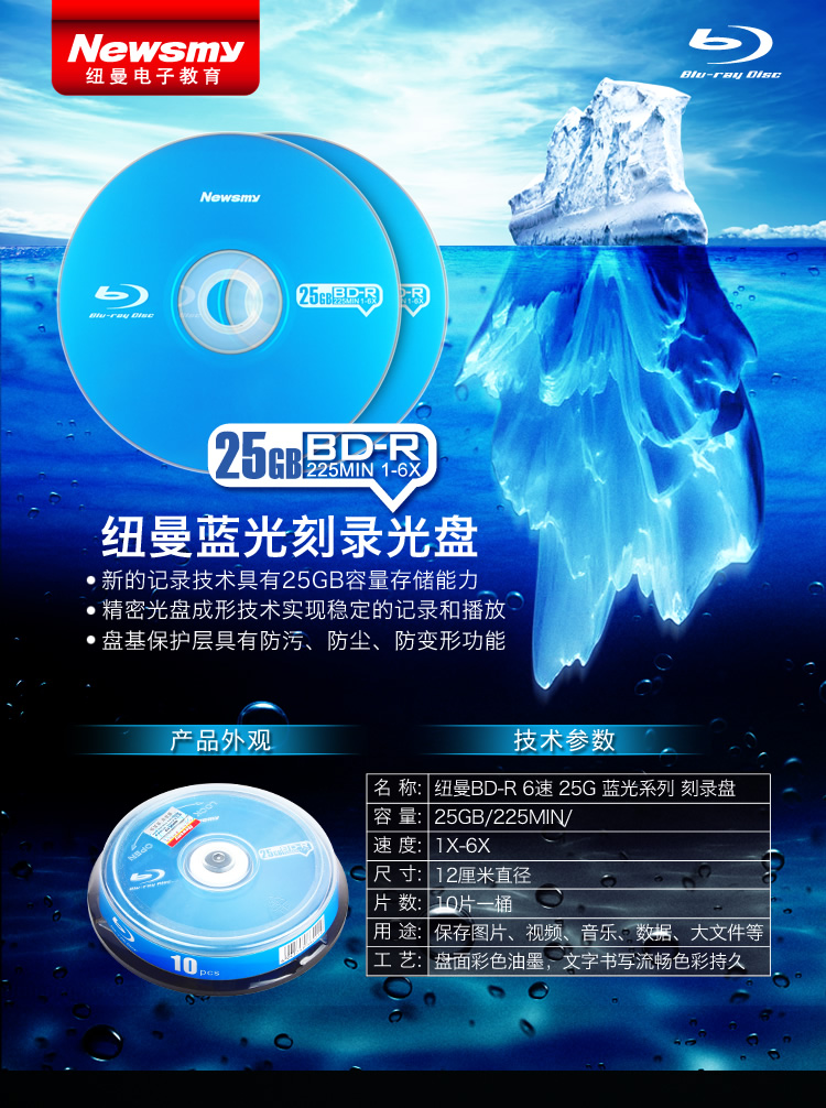 - 名称:纽曼(Newsmy) BD-R空白光盘蓝光光盘/刻录盘 25G蓝光 桶装10片