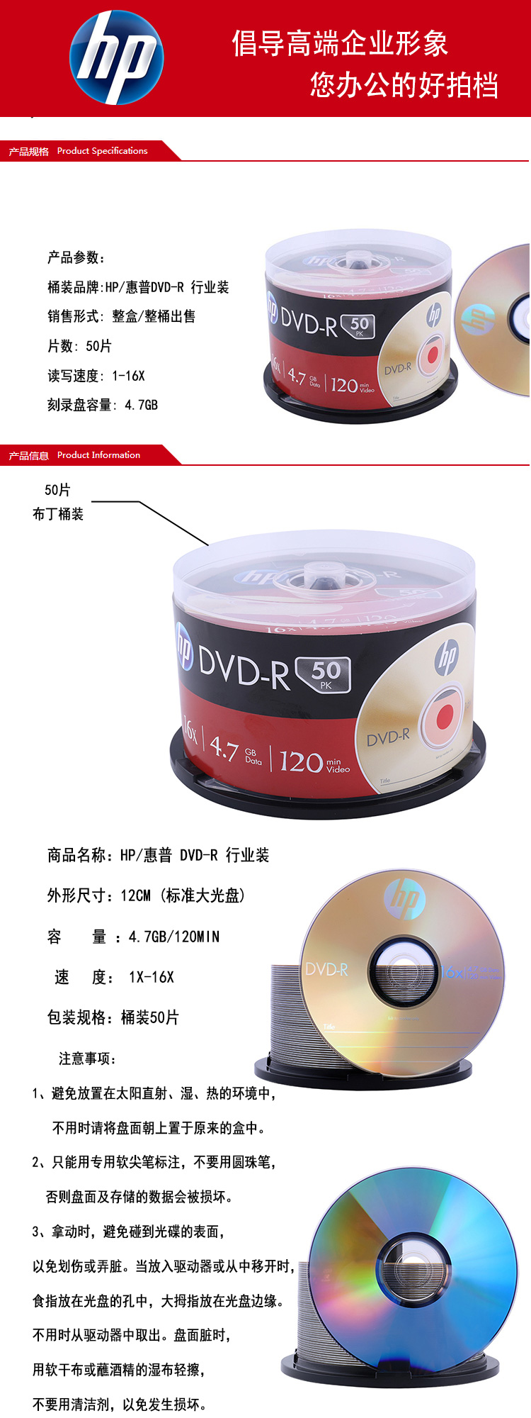 - 商品名称:惠普(HP) DVD-R 光盘/刻录盘 空白光盘 16速4.7GB 桶装50片
