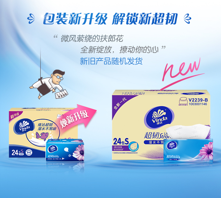 商品名称:维达(Vinda) 抽纸 超韧3层130抽软抽*24包纸巾(真S码) 整箱销售 湿水不易破
